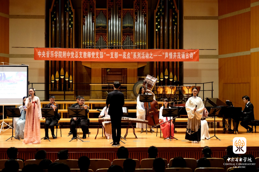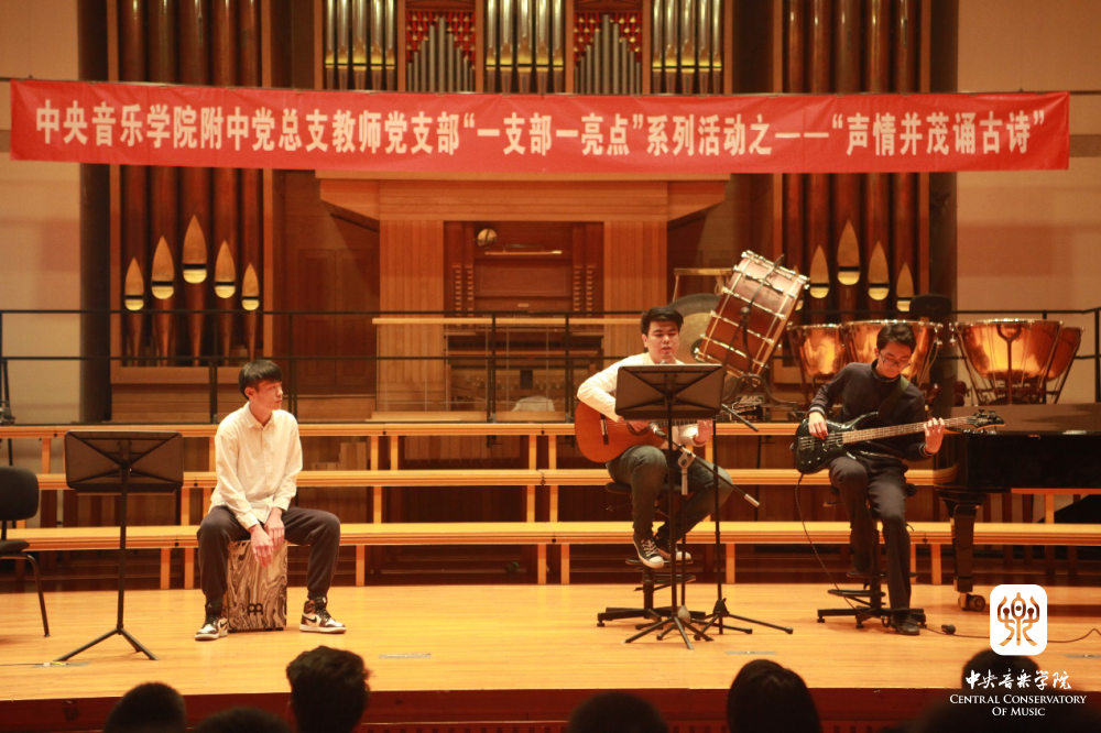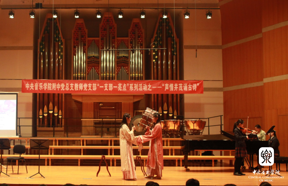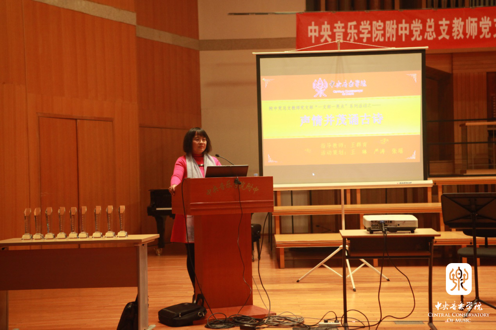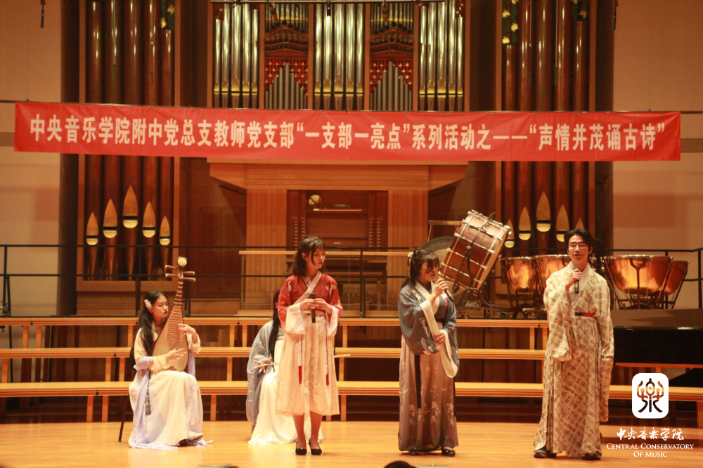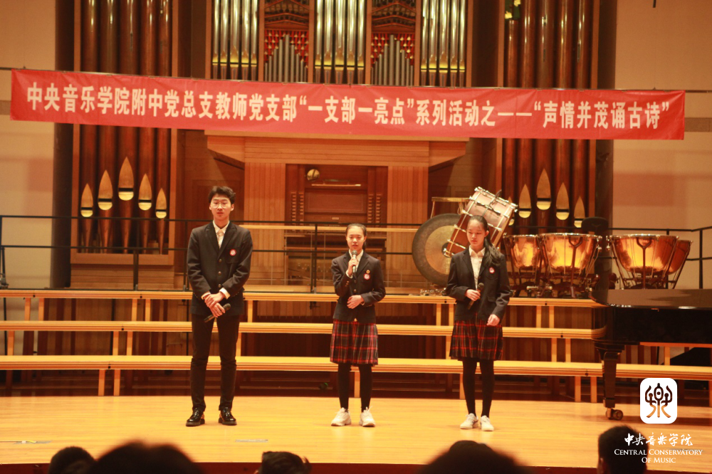 “声情并茂诵古诗” 是附中党总支教师党支部在“党建带团建”工作思路指导下的一次创新实践,也是支部结合自身特点,积极打造“一支部一亮点、一党员一旗帜”的系列活动之一。它力求发挥附中学生的音乐专长,以“和诗咏歌”的形式,给音乐赋予诗词能量,延续经典的生命力,通过诵唱让学生在潜移默化中接受诗词的熏陶,产生对美好生活的期待,对古典文化怀揣敬畏,感受中华文化的博大精深,从而更加热爱祖国和民族文化,最终在实践中探索符合音乐院校特色的传统文化教学模式。这些不同于知识灌输式的创新形式是学生喜闻乐见的——亘古绵延的“古老”知识,与富有巧思的“年轻”形式交相辉映、相得益彰。
