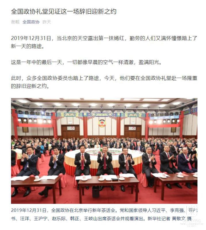 中国人民政治协商会议全国委员会12月31日上午在全国政协礼堂举行新年茶话会。党和国家领导人同各民主党派中央、全国工商联负责人和无党派人士代表、中央和国家机关有关方面负责人以及首都各族各界人士代表欢聚一堂,喜迎2020年元旦。