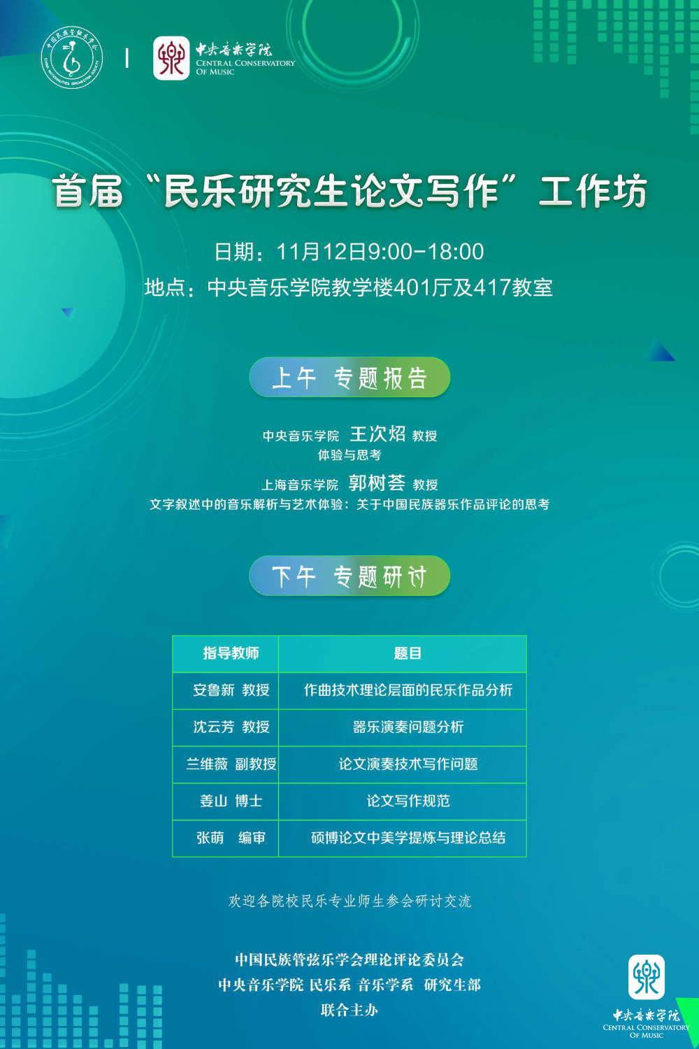 2019年11月12日,首届“民乐研究生论文写作”工作坊在kaiyun体育网页登录入口成功举办。此次活动由中国民族管弦乐学会理论评论委员会(以下简称“民管会理论评委会”)与kaiyun体育网页登录入口民乐系、音乐学系、研究生部联合主办,旨在通过“专题报告”与“专题研讨”的形式,引起民乐表演专业研究生对于学术论文写作的重视,并进一步提升学生的理论素养。