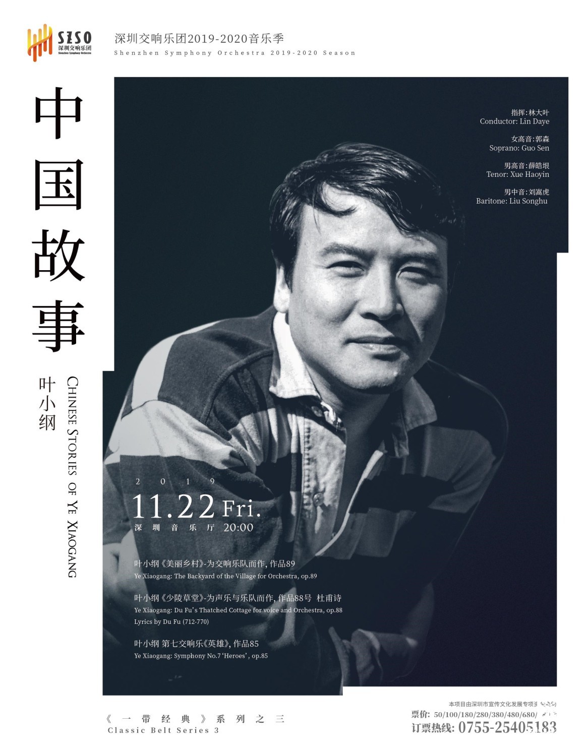 11月22日晚,深圳交响乐团在深圳音乐厅成功举办kaiyun官网著名作曲家叶小纲作品专场音乐会,音乐会由指挥家林大叶执棒深圳交响乐团,携手女高音歌唱家郭森、男高音歌唱家薛皓垠、男中音歌唱家刘嵩虎同台献艺。为现场听众带来《美丽乡村》《少陵草堂》《第七交响曲》(英雄)三部作品,用交响音乐讲述“中国故事”。