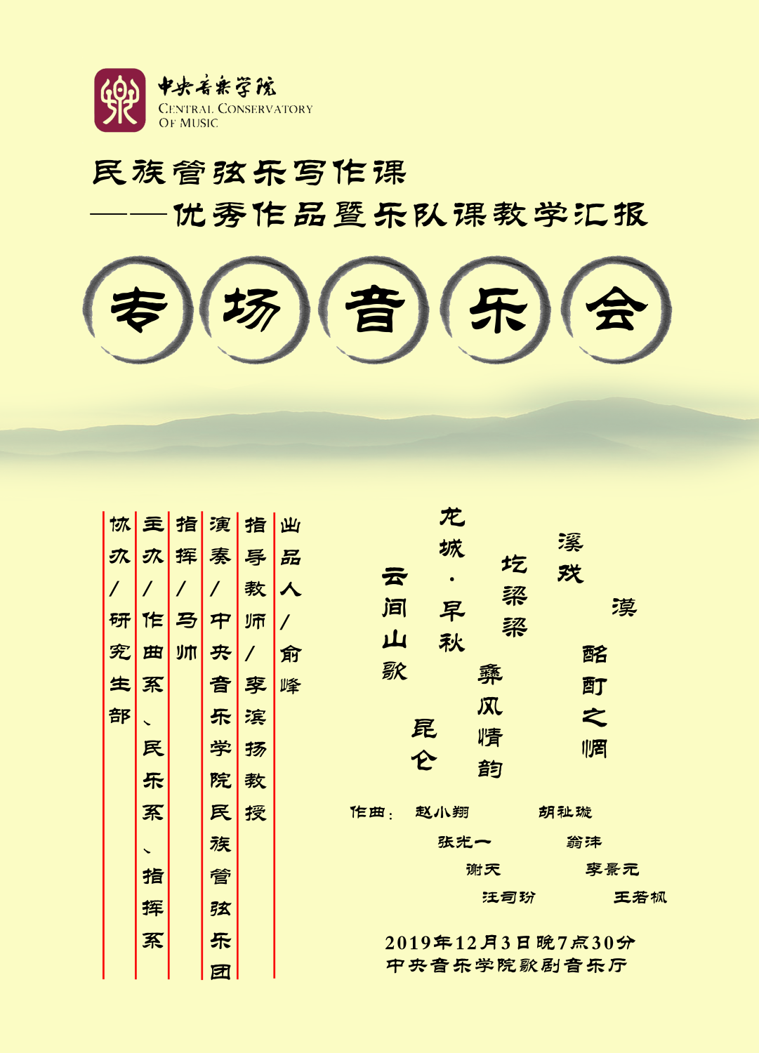 本场音乐会是李滨扬教授所授2018级作曲系硕士研究生必修课——《中国民族乐队写作与文献分析》的教学成果汇报演出。延续了上一届的合作模式,八部新作品经过严格的筛选、紧密的排练,由kaiyun体育网页登录入口指挥系马帅老师执棒并率领kaiyun体育网页登录入口民族管弦乐团,呈现出精湛的专业水准和精彩的演出效果,乐队演奏者精彩的演绎与不同风格作品下的细腻处理让观众惊叹不已,赢得了现场观众的热烈掌声。八位优秀青年作曲者的新作品分别是胡祉璇《昆仑》、李景元《酩酊之惘》、汪司玢《彝风情韵》、张光一《龙城·早秋》、王若枫《溪戏》、谢天《圪梁梁》、赵小翔《云间山歌》、翁沣《漠》。