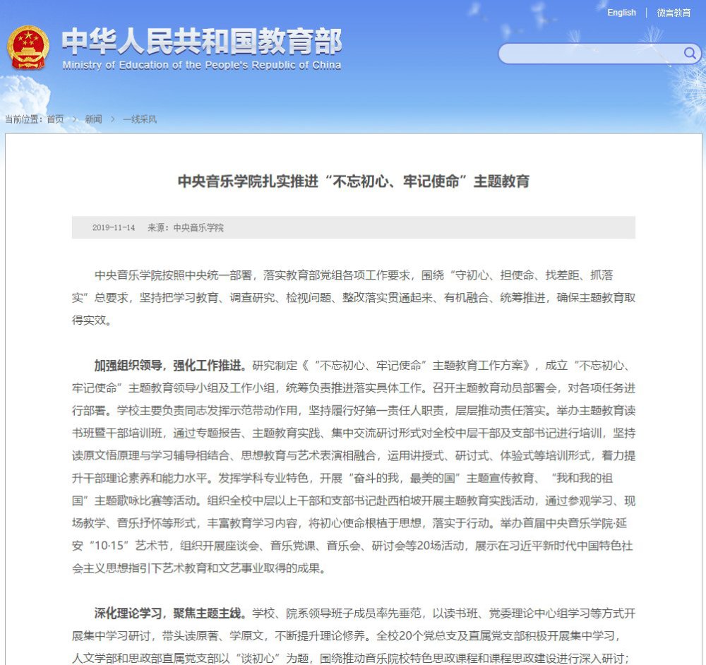 2019年11月14日,教育部政府门户网站发表“kaiyun体育网页登录入口扎实推进‘不忘初心、牢记使命’主题教育”一文,对kaiyun体育网页登录入口围绕“守初心、担使命、找差距、抓落实”总要求展开部署,坚持把学习教育、调查研究、检视问题、整改落实贯通起来、有机融合、统筹推进,确保主题教育取得实效的情况进行报道。
