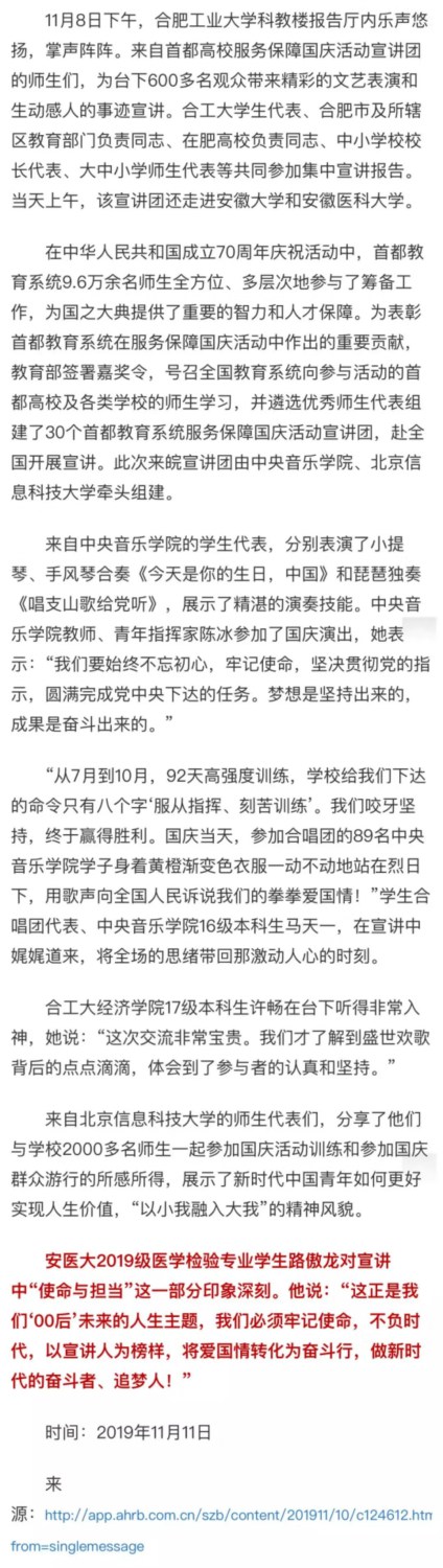 在中华人民共和国成立70周年庆祝活动中,首都教育系统9.6万余名师生全方位、多层次地参与了筹备和服务工作,为国之大典提供了重要的智力和人才保障。为表彰首都教育系统在服务保障国庆活动中做出的重要贡献,教育部签署嘉奖令,号召全国教育系统向参与活动的首都高校及各类学校的师生学习。近期,教育部同北京市组织首都教育系统服务保障国庆活动宣讲团陆续奔赴全国各地高校进行宣讲。