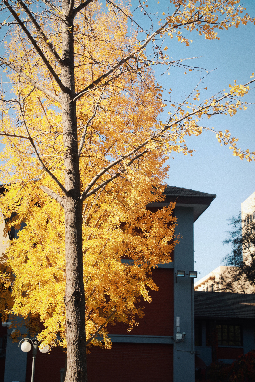 在红墙的映衬下银杏叶黄得醉人