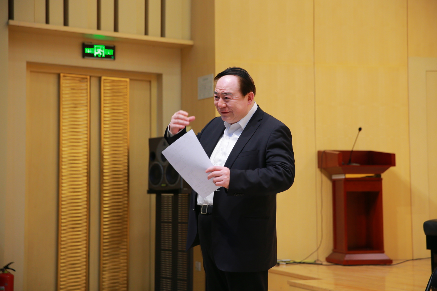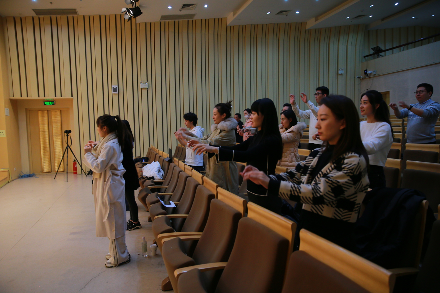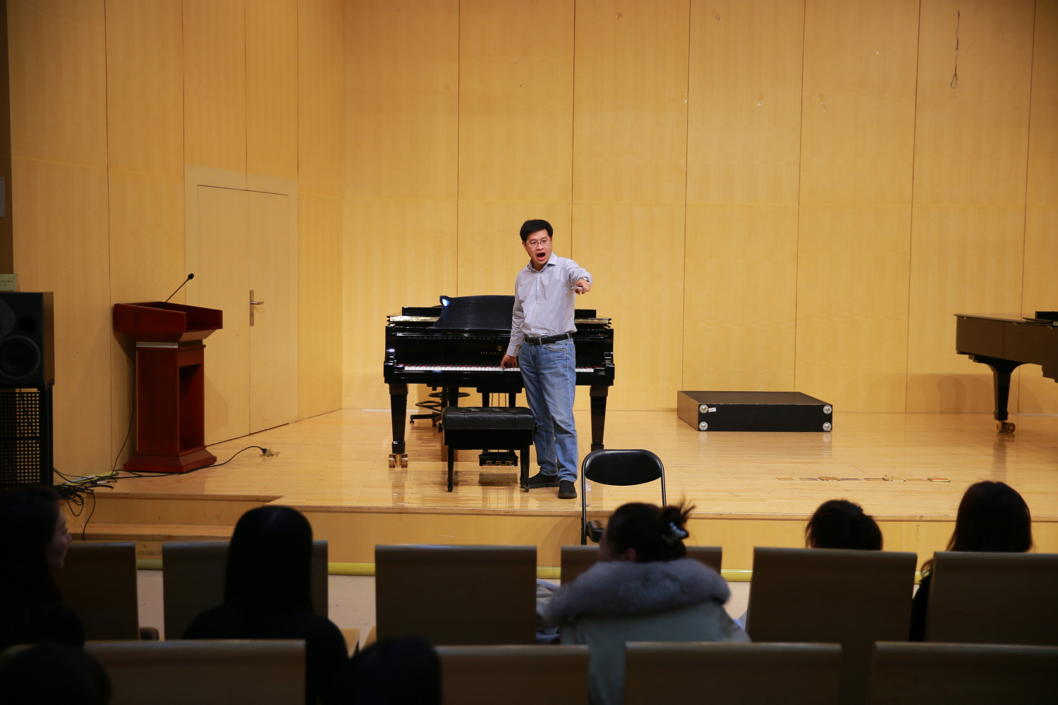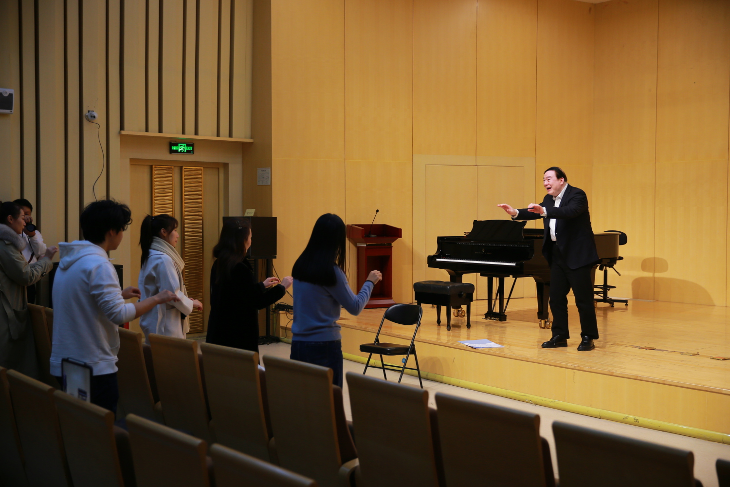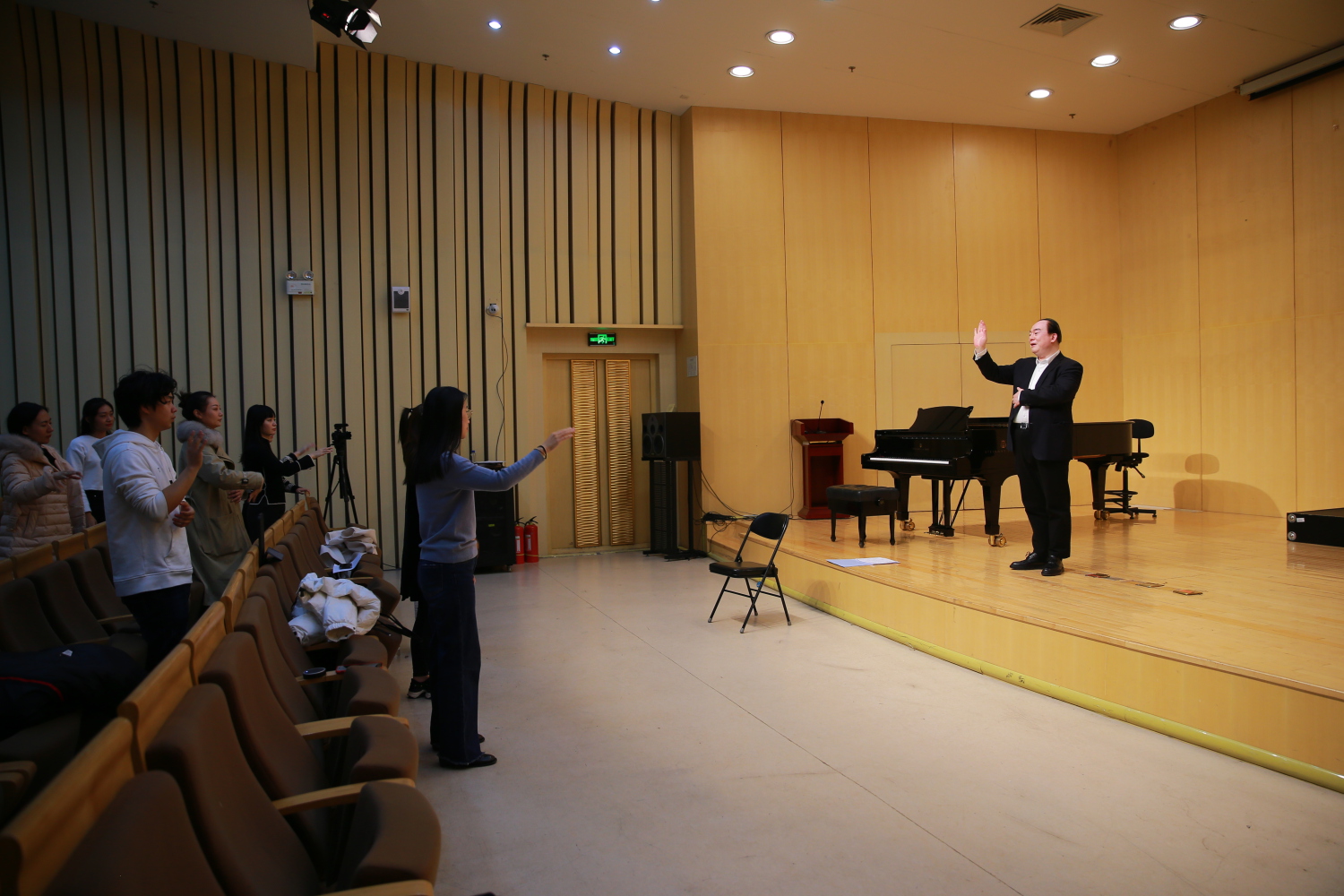 下午4点,俞峰院长为大家“临阵磨枪”,携手指挥系杨力教授在教学楼1001演奏厅为宣讲师们讲授了一堂精彩的合唱指挥课。