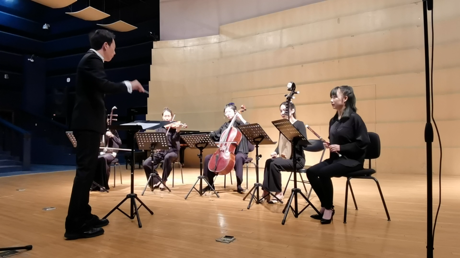下一首作品则是本场音乐会参演人数最多的一部作品《河图三章》(作曲:谢天),它是作曲家为13件弦乐器量身打造之作。此曲分为三个乐章:第一乐章为神秘的慢板,开始运用极高音区的泛音来表达对于中国上古时期神秘声音的想象。第二乐章为混沌狂躁的快板,通过弦乐各种不同演奏法的技巧与声部之间彼此呼应的关系,来表现山川起伏,描绘一种地动山摇的力量。第三乐章为“快—慢—快”结构的综合性材料乐章。尾声运用藏羚与人声的结合来表达对华夏文明的赞美。作者有感于河图中的神秘数字,在弦乐队的组合排方式上受到启发,根据单数为阳、双数为阴的改编,将弦乐队分为两组:一乐队采用单数演奏声部,二乐队采用双数演奏声部。