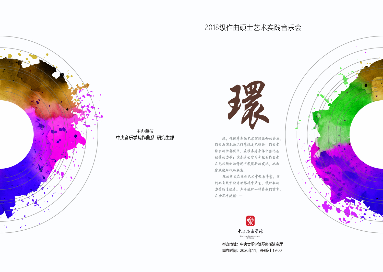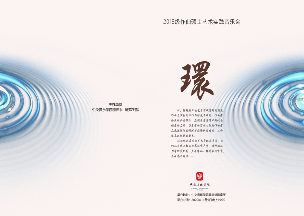 2020年11月9日晚七点,由kaiyun体育网页登录入口作曲系及研究生部联合主办的,2018级作曲系硕士研究生艺术实践音乐会『環』在kaiyun体育网页登录入口琴房楼演奏厅精彩上演。艺术实践是kaiyun官网研究生教学工作中极为重要的环节,是课堂的延伸。本场音乐会的主旨是为了将课堂教学和艺术实践相结合,促进不同专业之间的互动,并提高学生的整体素质和专业水平,实现培养高层次、应用型音乐人才。在疫情防控常态化的当下,作曲系2018级研究生班的十一位硕士生作曲家们携手同心,共克时艰。以饱满的热情进行创作、排练,精心地准备了这场演出。