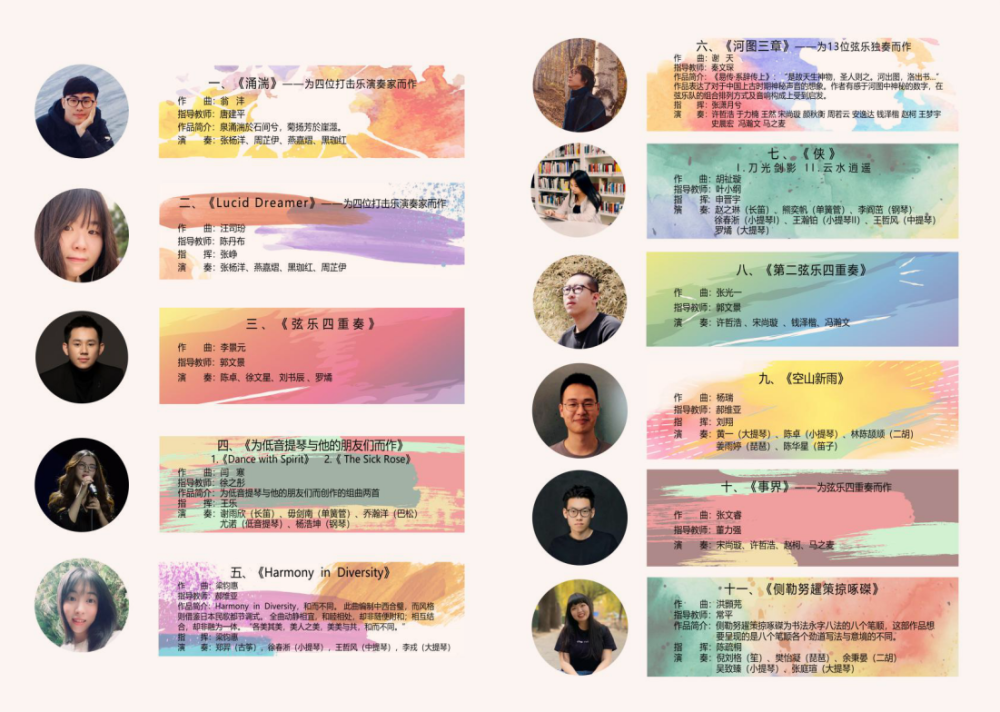 本场艺术实践音乐会共上演11首室内乐作品,其中,作曲家们所使用的乐器种类涵盖了多种西洋管弦乐器、民族管弦乐器及各类打击乐器。经过作曲家的细致工作,以及各位演奏者的精彩诠释,使得音乐会最终以一个很高的完成度予以呈现。按出场顺序为翁沣的《涌湍》、汪司玢的《Lucid Dream》、李景元的《弦乐四重奏》、闫寒的《为低音提琴与她的朋友们而作》、梁钧惠的《Harmony in Diversity》、谢天的《河图三章》、胡祉璇的《侠》、张光一的《第二弦乐四重奏》、杨瑞的《空山新雨》、张文瑞的《事界》、洪灏芫的《侧勒努趯策掠啄磔》。