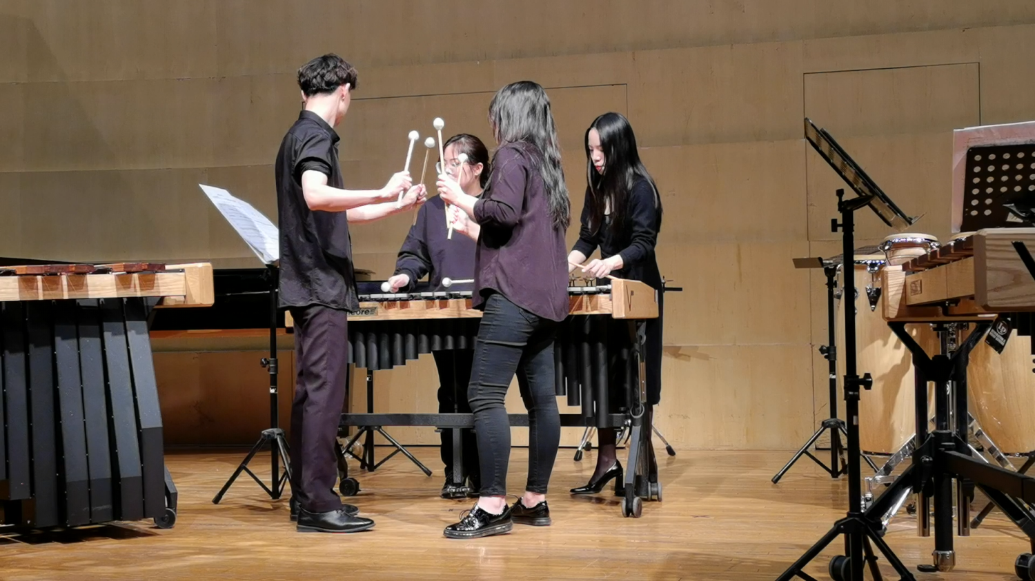 本场音乐会的第一个节目《涌湍》(作曲:翁沣)是一部为四位打击乐演奏者而作的作品。该作品为三段体结构,各段落分别描绘了水流的湍急、平缓以及汹涌的形态。在乐曲开头与结尾段落,四位演奏家分别演奏不同的乐器,中间段落则聚集在一起,共同演奏颤音琴,形成了“分——合——分”的演奏形式。