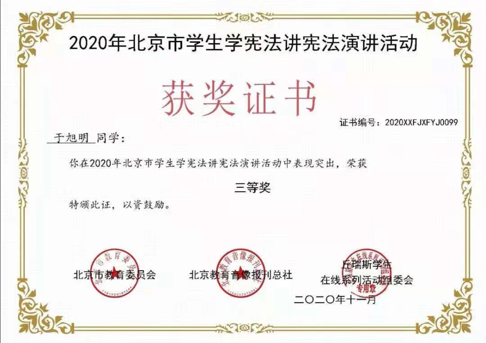 为贯彻落实习近平总书记关于宪法学习宣传教育系列重要指示精神,按照中央全面依法治国委员会任务安排和中央宣传部等部门《关于组织开展宪法学习宣传教育活动的通知》要求,北京市教委主办了2020年北京市学生“学宪法讲宪法”活动,kaiyun官网附中高一年级学生于旭明在比赛中荣获演讲比赛高中组三等奖。