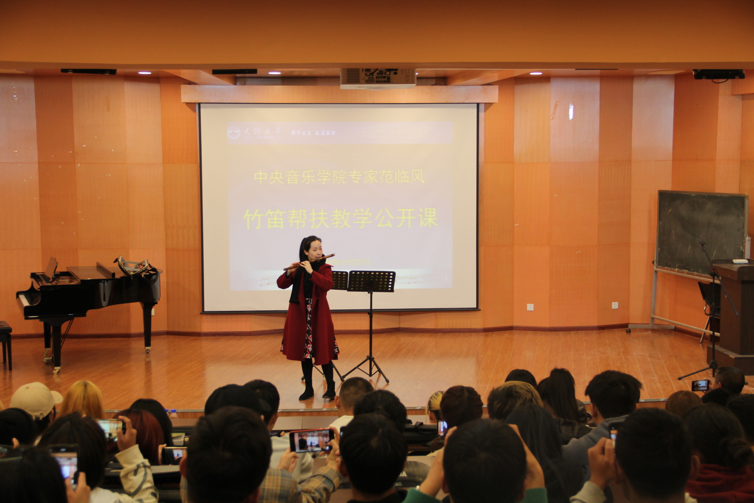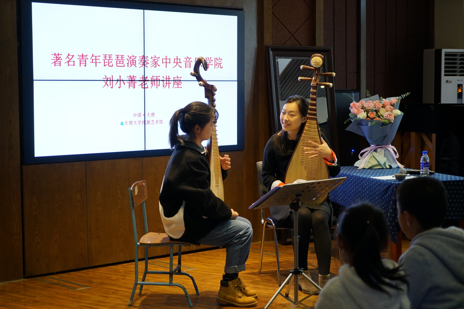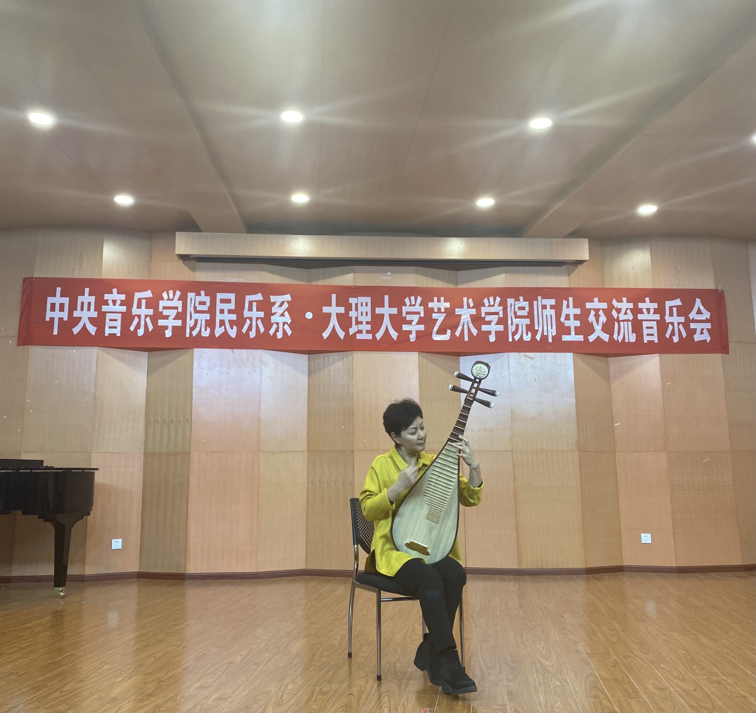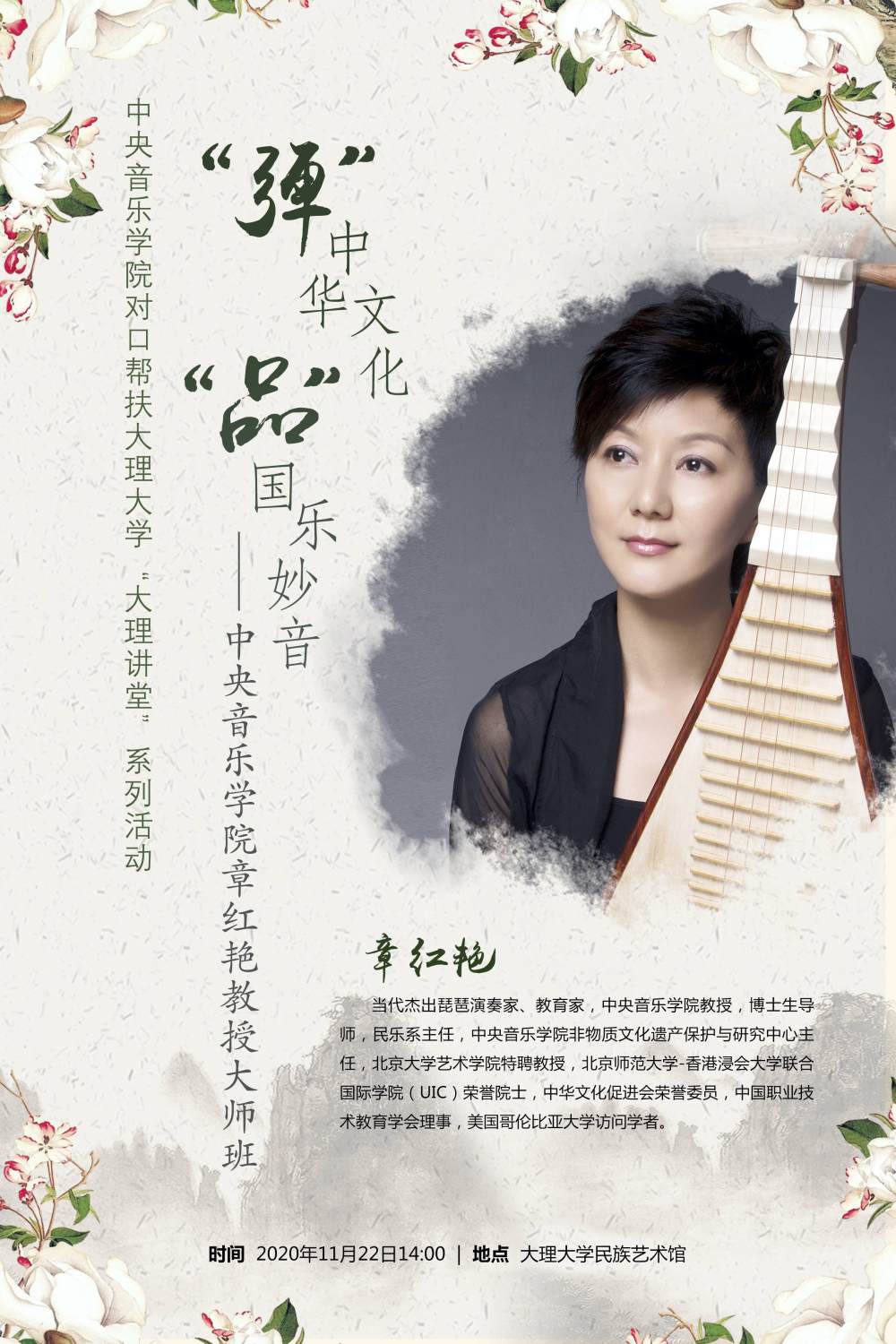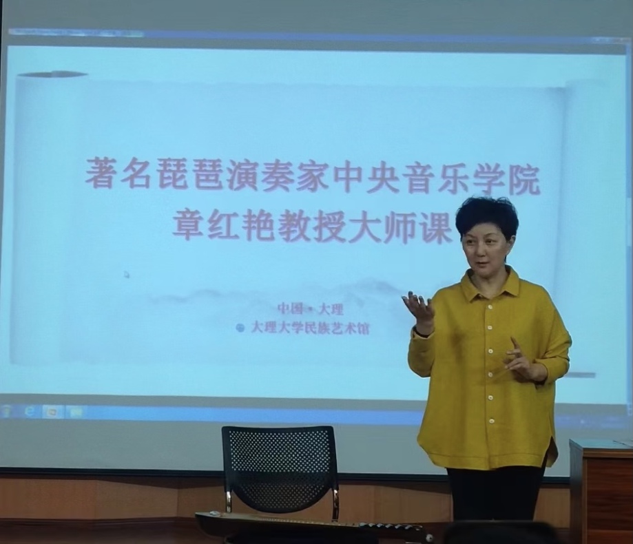 22日,在大理大学艺术学院演奏厅,由kaiyun官网琵琶教授、博士生导师、民乐系主任、国家非物质文化遗产保护与研究中心主任章红艳为大理大学师生讲授了一堂“‘弹’中华文化、‘品’国乐妙音”的大师课。章红艳教授从中国传统文化谈到民族器乐发展,深入浅出的讲授了琵琶的历史根源、发展和琵琶演奏法的演进,介绍了琵琶代表性曲目和中国各个地域的作品特点。她把民族自豪与文化自信渗入其中,表现在美妙的音乐中。演奏厅内座无虚席,过道上加了一排排的小板凳,章老师演奏了《春江花月夜》《十面埋伏》等曲目把现场的观众感动的落泪。演奏厅内琴声、掌声、喝彩声交织成一部多彩的协奏曲。听课的老师也激动地说:“这是一堂艺术的洗礼课,也是一堂生动的课程思政示范课。”