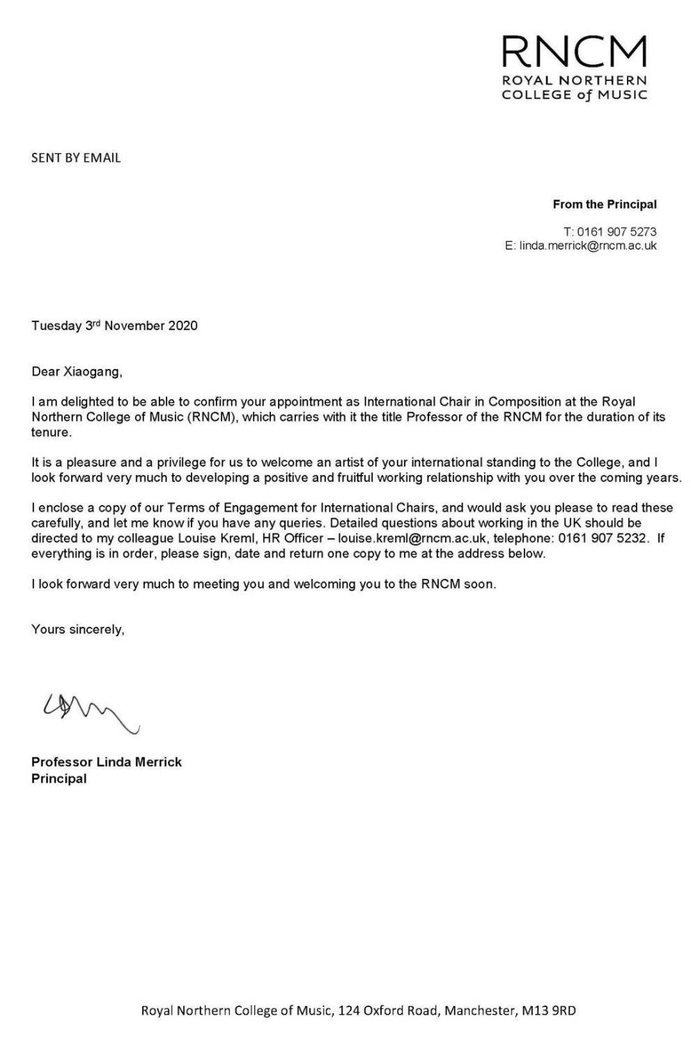 我很高兴能够确认你被聘任为北方皇家音乐学院(RNCM)的国际作曲教授,在本学院的任期内具有北方皇家音乐学院教授的头衔。