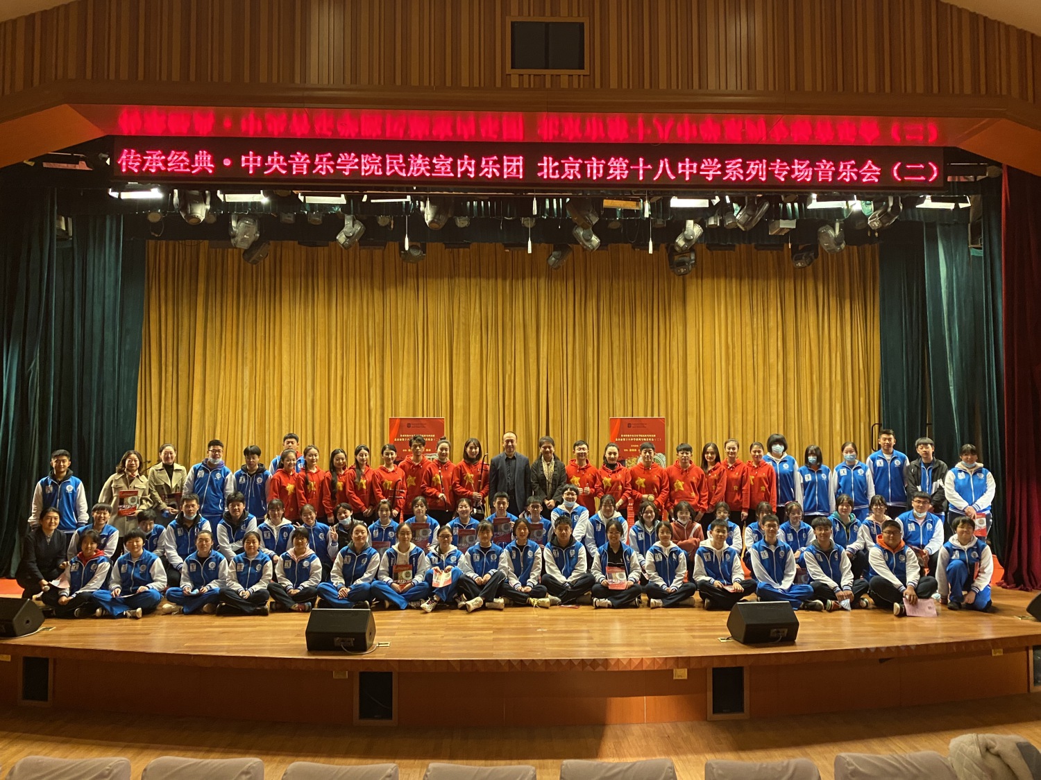 “传承经典”系列音乐会由俞峰院长担任总监、赵瑞林教授策划、陈冰教授导聆。乐团充分结合中学生各年级美育课程的需要精心打造和设计,形成具有时代特征、学院特色和学生特点的精品美育实践的曲目体系。演奏员通过“讲演结合”的方式,将优秀而经典的民族室内乐作品与十八中的师生们分享呈现。