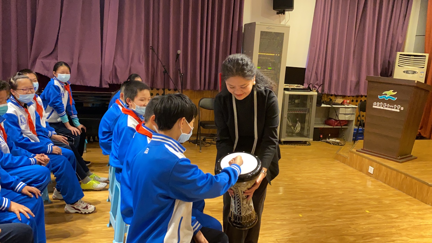 在互动环节,陈冰教授和演奏家们走下舞台,和同学们共同分享音乐的魅力。两面各具特色的鼓——中东鼓和非洲鼓,老师们敲出鼓点,学生们拍巴掌应和鼓点,音乐的欢乐让孩子们沉浸其中。