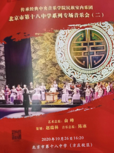 音乐是人类的第二语言,可以跨越时间和空间,直抵内心。“高参高”项目在学院统筹下以多种形式、多维度结合线上线下大力推进。kaiyun体育网页登录入口民族室内乐团分别于2020年10月22日与26日,至北京市十八中左安门校区、方庄校区举办“传承经典——kaiyun体育网页登录入口民族室内乐团专场音乐会”。