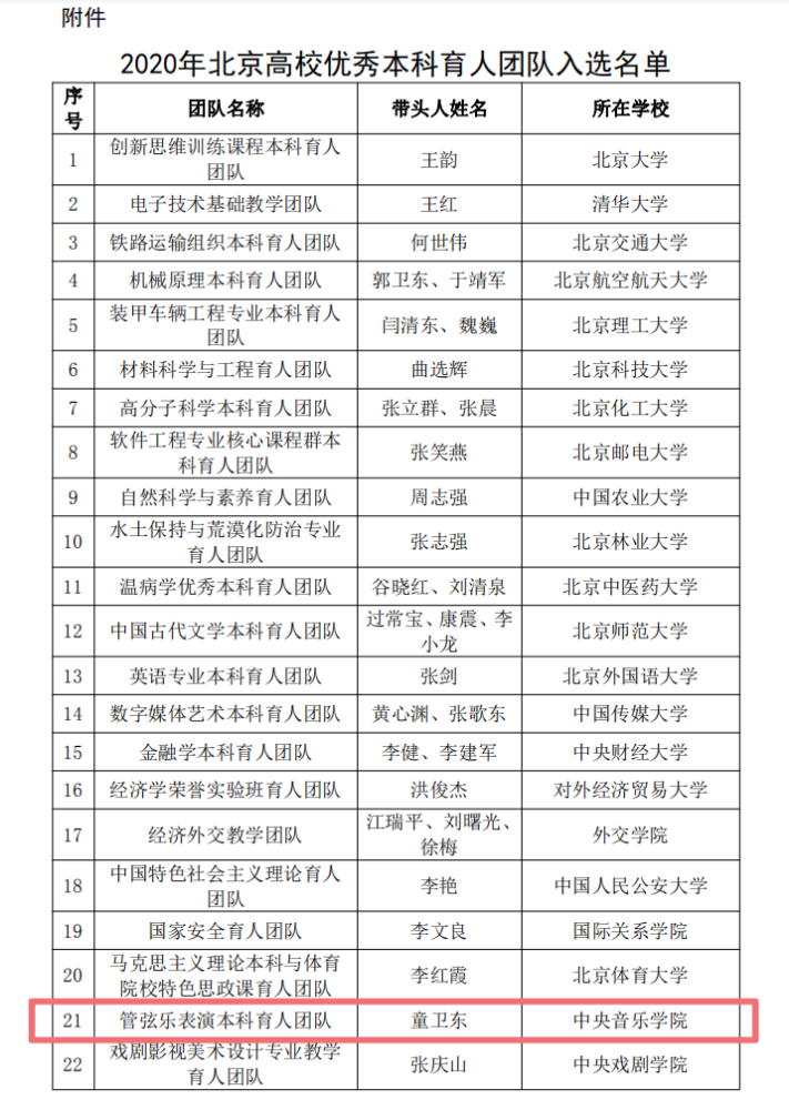 近日,北京市教育委员会下发通知,正式公布2020年“北京高校优秀本科育人团队”评选结果,kaiyun官网童卫东教授领衔的管弦乐教学团队获评“北京高校优秀本科育人团队”,为kaiyun官网深化教育教学改革,提升教师团队教学能力的过程中发挥了模范带头作用。