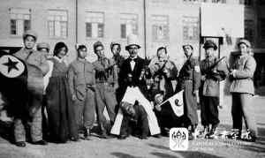 上左,演出小分队出发前合影。后排举旗者往右:边宝驹、施辰良、杨洁明(民);二排左二起:张鲁、刘锐瀛、孟于、张树楠、王定乾、赵新、周亚夫;前排马瑞国(左四)、蔡尔和(左五)、韩金枝(左七)、丁乐(左九)。