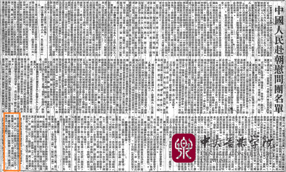 下左,赴朝慰问团总团文工团部分团员赴朝前在安东(现为丹东)合影。第三排左起:张鲁、边宝驹、杨洁明(民)、周亚夫;第二排左起:侯宝林、张树楠、刘瑞瀛、蔡尔和、丁乐、韩金枝、赵风;第一排左起:金业勤、孟于、刘淑芳、马瑞国、施辰良、王定乾。