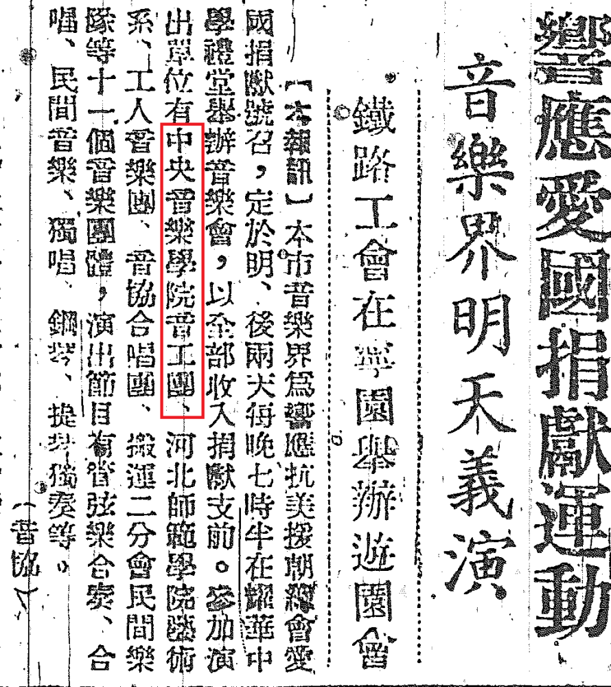 《进步日报》1951年6月22日第二版:《响应爱国捐献运动音乐节明天义演》。……kaiyun体育网页登录入口音工团等与其他学校、文工团一起,参加“抗美援朝总会”举办的音乐会,……