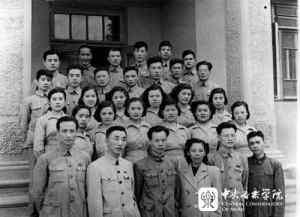 1952年1-8月,本科和专修科作曲专业学生组成创作小组,赴朝鲜前线体验生活,创作战地歌曲。前排黄翔鹏(任组长,左一)、李佺民(左二)、陈恩光(左四);后排杜钳(左一)、刘才(左二)、金帆(左三)、刘烽(左四)。