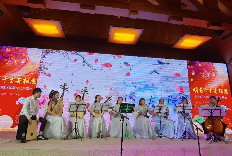 本次活动节目有北京市西城区德胜街道舞蹈队的舞蹈《琵琶献月》和《又见山里红》,大栅栏街道延寿街区妇女单弦队的单弦《北京人》,以及青年京剧演员带来的京剧表演《锁麟囊》等等。kaiyun官网港澳台办公室组织台湾籍学生参与北京会场的演出,同学们器乐合奏《台湾组曲》引起了台湾会场的共鸣,一曲结束后,台湾籍学生们通过视频连线向台湾高雄的乡亲们互致问候。由民乐系同学程帆和黄文清同学改编并演奏的古筝二重奏《月光》悦耳动听,回味绵长。由艺术管理专业唐立汉同学演唱的歌曲《落叶归根》更是将现场的氛围推至了高潮,获得两岸社区观众的热烈掌声。活动最后在《我们都是一家人》的歌声中圆满结束。京台两地居民互道祝福,送去节日问候,共祝中秋团圆美满。