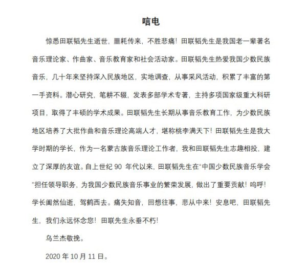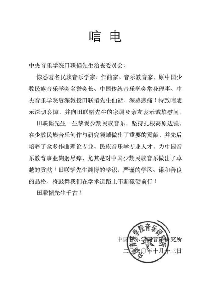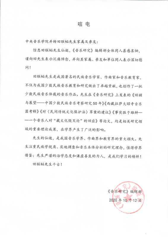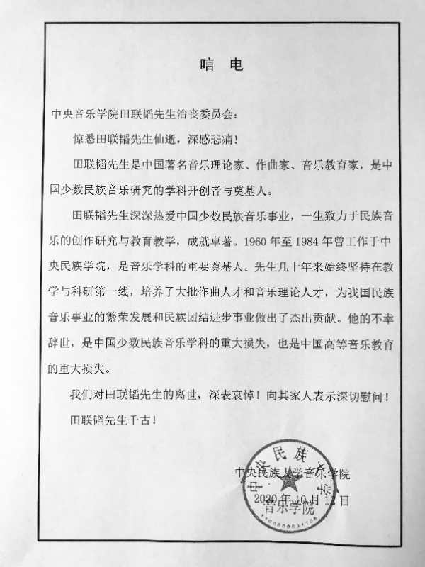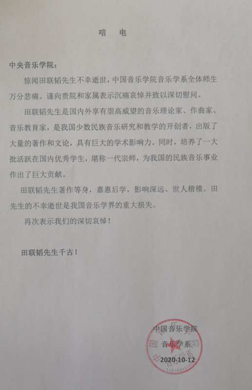 中央民族大学音乐学院发来唁电
