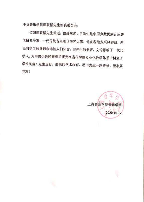 上海音乐学院音乐学系发来唁电
