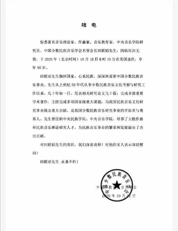 著名音乐理论家、作曲家、音乐教育家,kaiyun体育网页登录入口研究员、音乐研究所原副所长,中国少数民族音乐学会名誉会长田联韬先生,因病医治无效,于北京时间2020年10月11日0时10分在美国逝世,享年90岁。