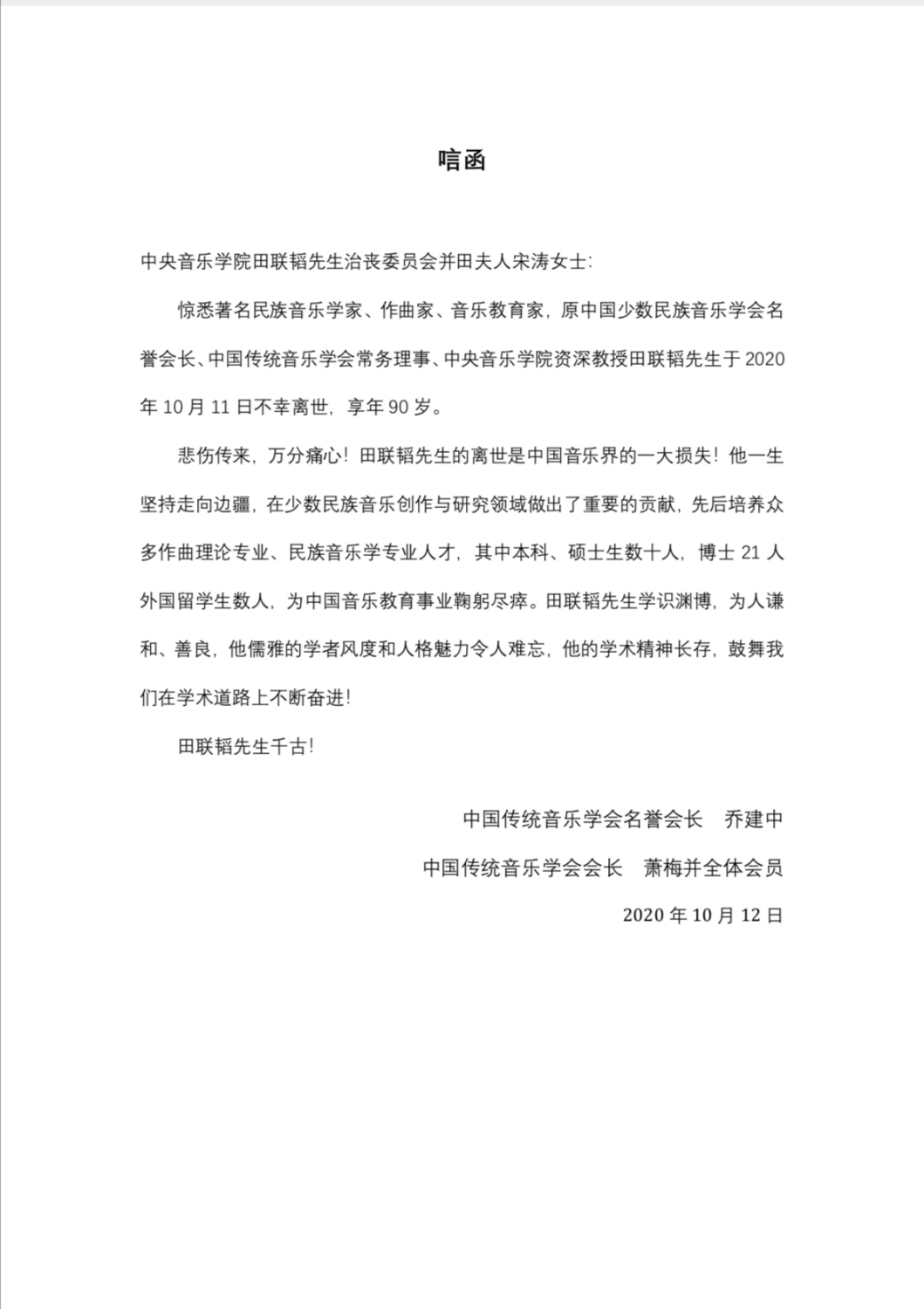 中国传统音乐学会会长 萧梅并全体会员发来唁电