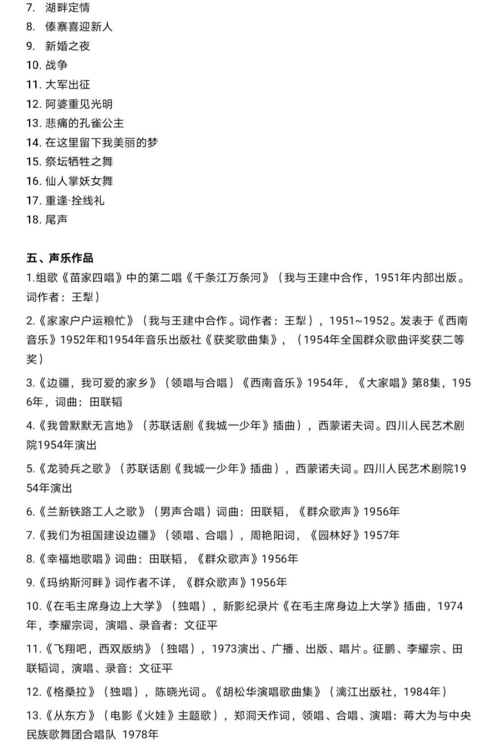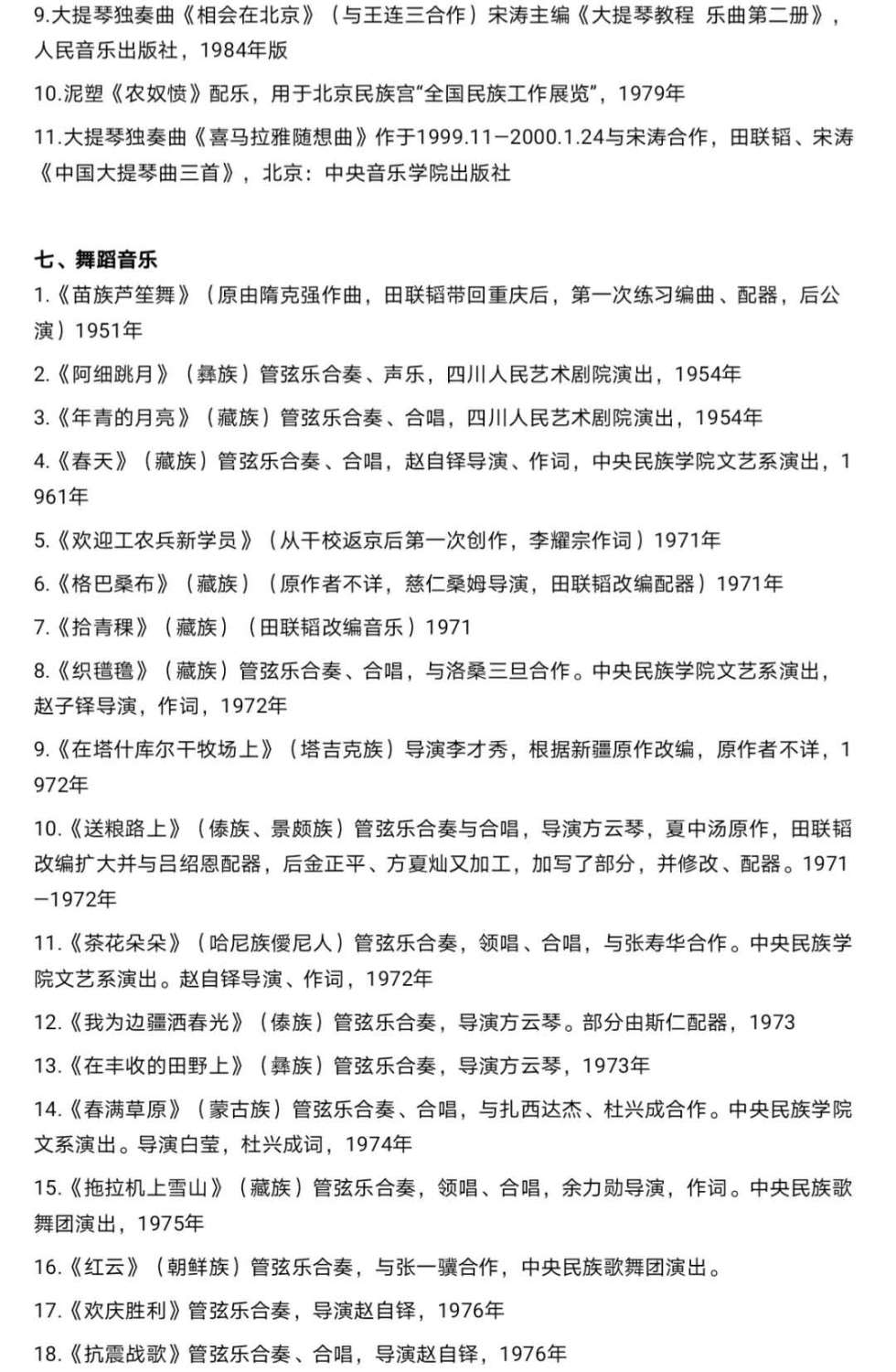 田联韬教授不仅是深受学界推崇、爱戴的资深民族音乐教育家和理论家,他还是出过众多优质、高产音乐作品的杰出的作曲家。从上世纪中叶以来,他创作了一批少数民族音乐题材的优秀作品,如电影音乐《孔雀公主》、《火娃》、《第三女神》、《爬满青藤的木屋》等;电视音乐:《红岩》、《非洲纪行》等;舞剧音乐《凉山巨变》(合作)、《阿凡提的故事》等;舞蹈音乐《黄河之水天上来》、《茶花朵朵》、《织氆氇》、《送粮路上》(合作)等数十首;钢琴曲《塔吉克舞曲》、《天山的节日》,小提琴曲《帕米尔随想》,大提琴曲《红河的孩子》、《喜玛拉雅随想曲》(合作)等。1983、2005年先后在香港、北京出版发行电影音乐《孔雀公主》磁带、密纹唱片、CD光盘。在这些作品中,田师总是能够恰当地把握好音乐体裁和民族风格的关系和火候,充分发挥自己长期学习、钻研少数民族音乐的优势,让自己的创作既能够让音乐界同行满意认可,也要让本民族群众和广大听者、观众由衷地喜爱和接受。
