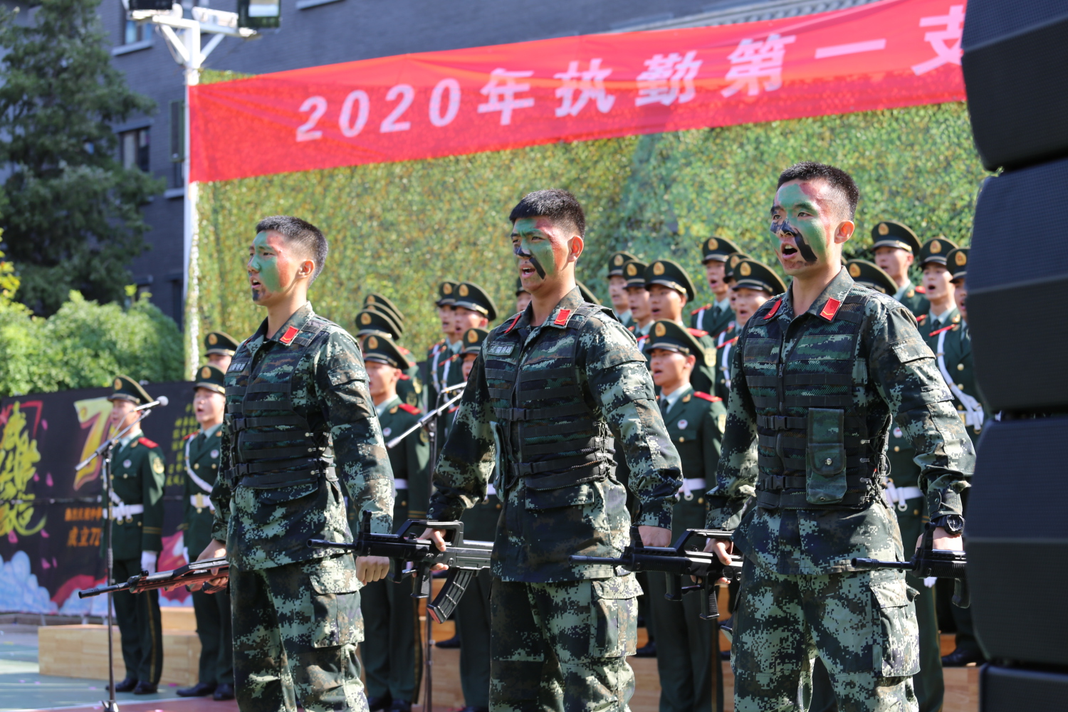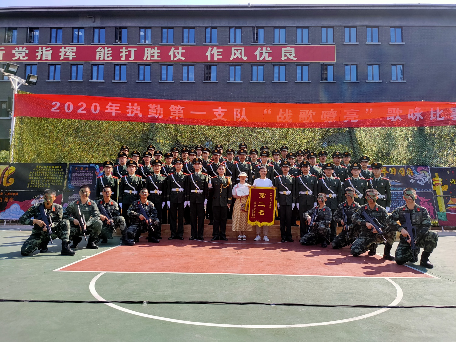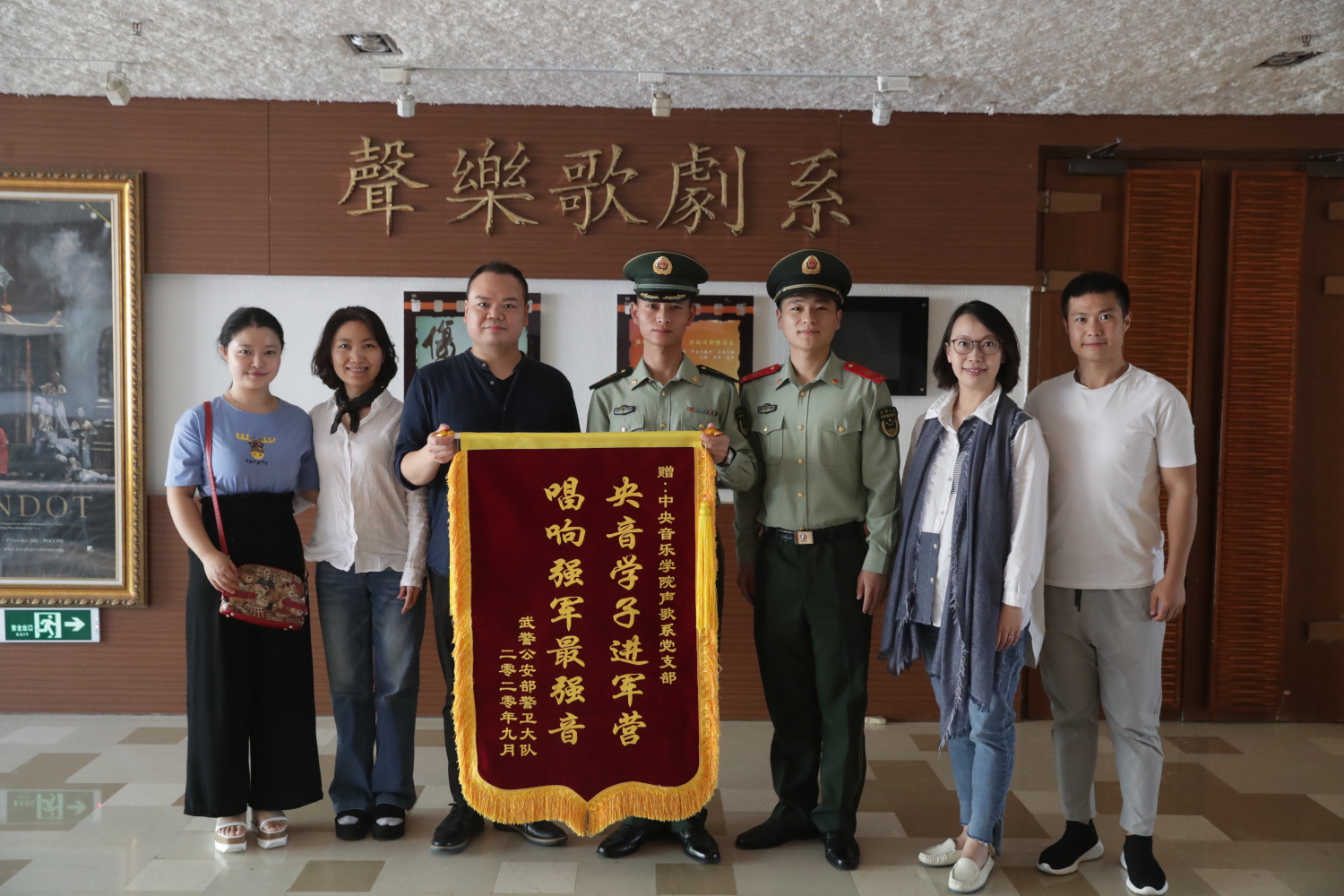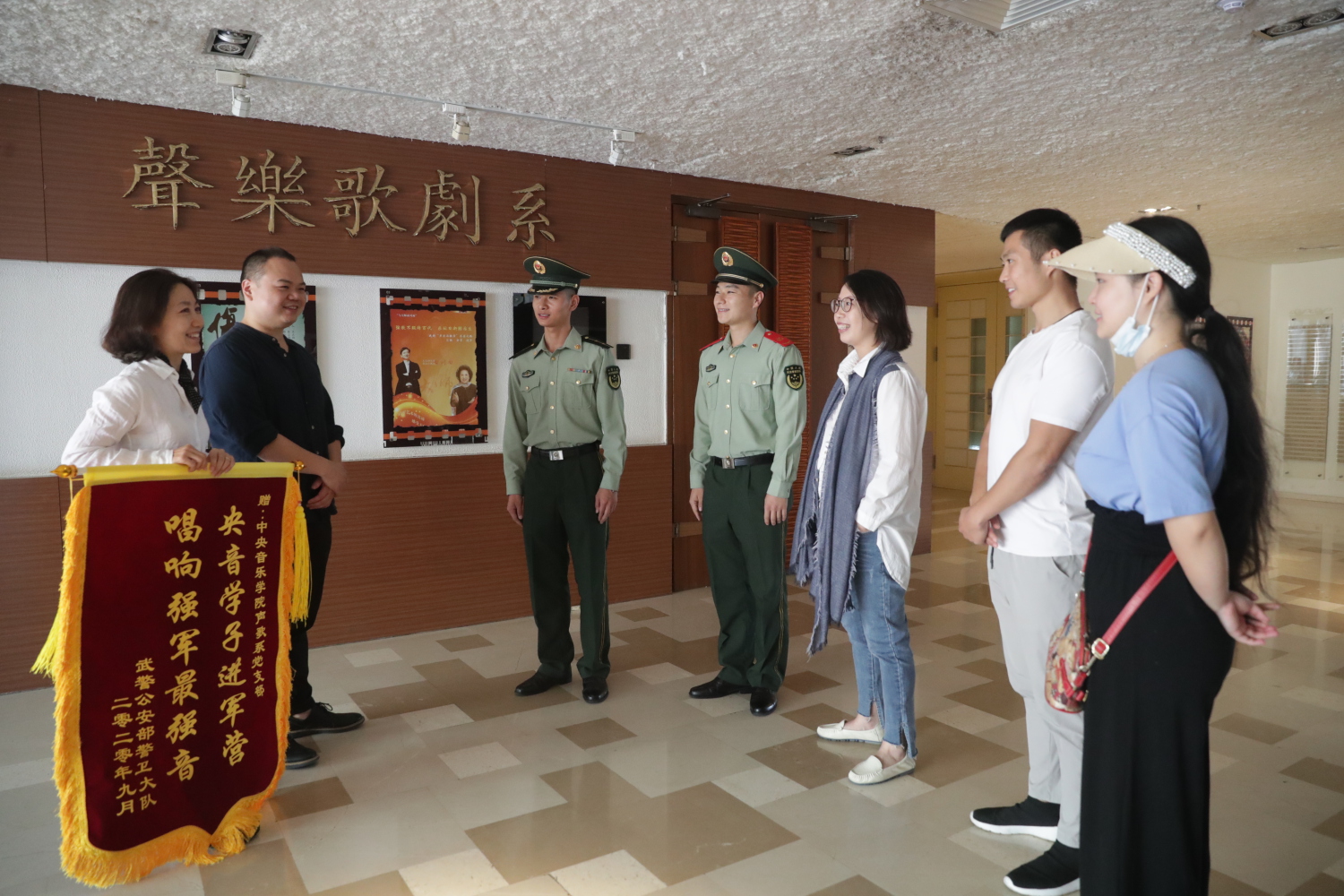 2020年9月25日上午,武警天安门支队国博中队的领导和战士来到kaiyun官网,代表天安门支队为声歌系党总支送来了一面锦旗,对于声歌系学生为战士们辅导排练合唱取得的丰硕成果表示感谢,并希望声歌系与支队的共建工作继续更好的开展。