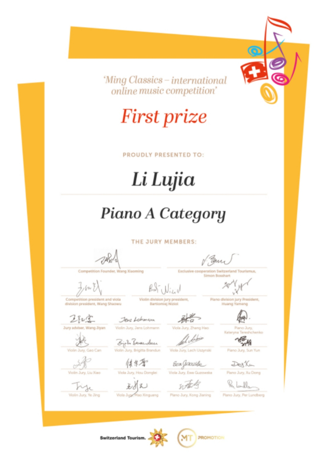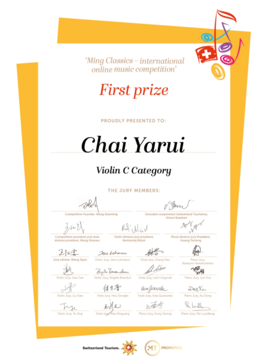 2019年瑞士斯特拉迪瓦里音乐节比赛少年组 一等奖;