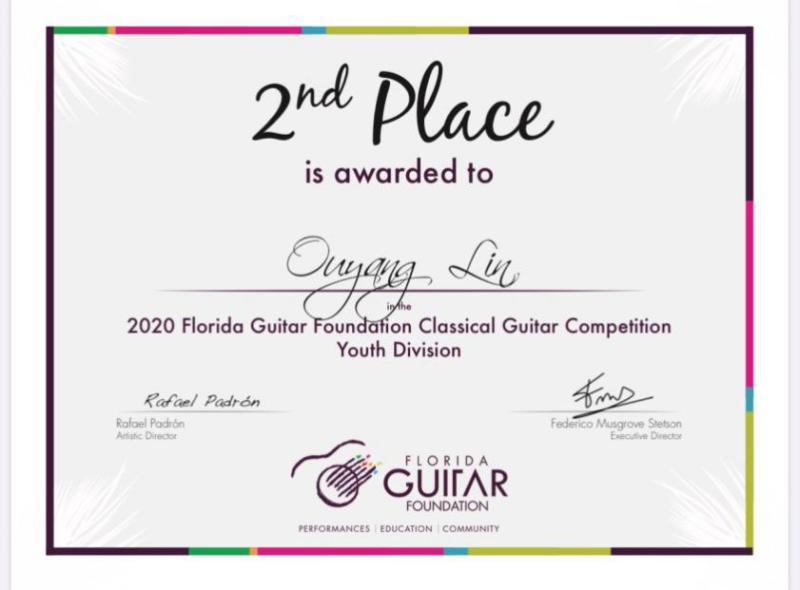 在美国东部时间2020年9月6日,Florida Guitar Foundation举办的国际古典吉他比赛中,附中古典吉他专业学生王钤正、欧阳霖分获青年组冠、亚军。