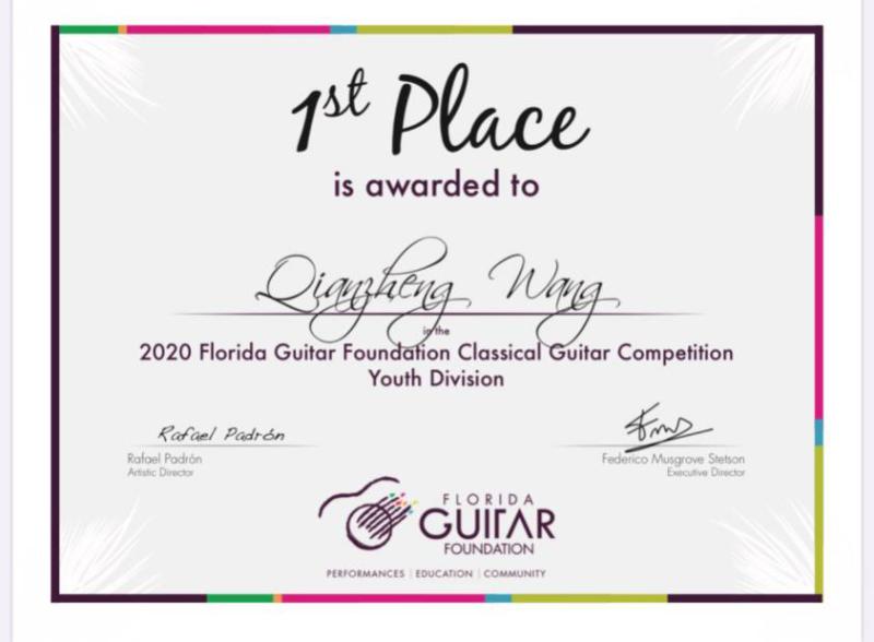2020年9月,获得美国佛罗里达吉他基金会举办的线上国际吉他比赛中获得青年组冠军。
