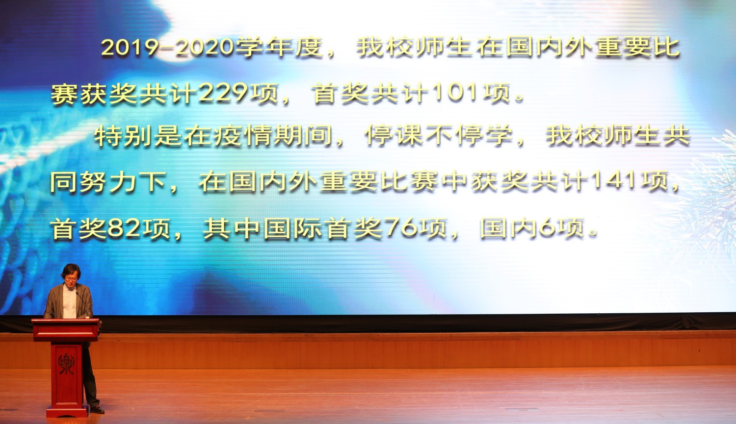 从学校第一次召开疫情防控工作部署会,到给湖北师生送去口罩……从音乐治疗专业师生前往一线支援,到学校积极创作抗疫作品……从紧急筹备招生,到努力帮助学生就业……随着《那段时光》视频的播放,俞院长带领大家深情回顾了抗疫期间学校走过的那段特殊而难忘的旅程,全场师生不禁潸然泪下。2020年这一段时光对于你,对于我,对我们每一个人都将是永生难忘的,但无论如何,kaiyun体育网页登录入口永远都是每一位央音人温暖的家。