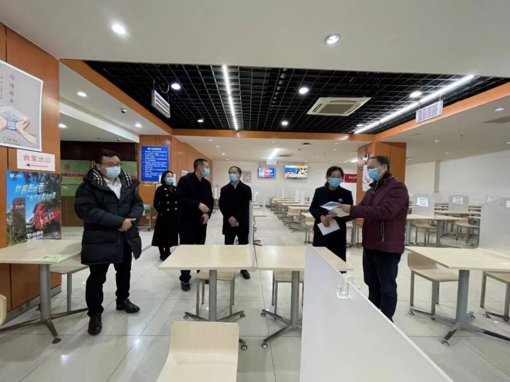 在检查重点之一的食堂检查现场,校领导详细了解人员健康检查、疫苗接种、人物同防的定期核酸检测、冷链食品管理及溯源、就餐桌椅设置、食堂限流措施等情况,建管处也做了专门汇报。