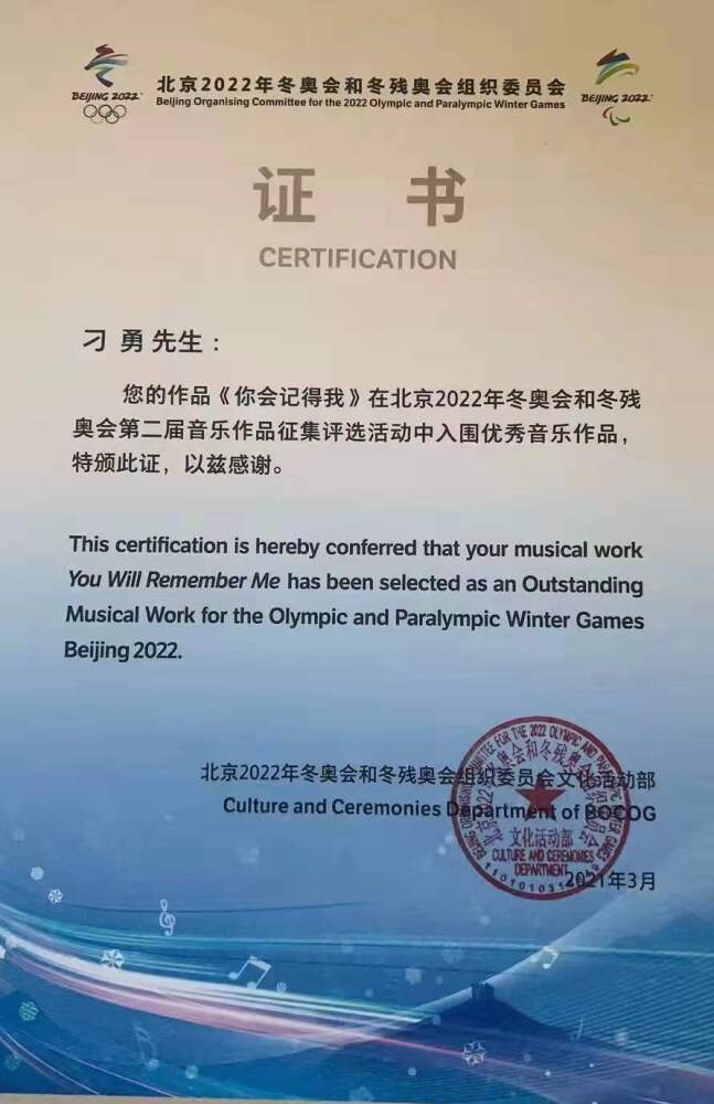 2020年8月,北京冬奥组委联合中国文联共同启动了第二届冬奥音乐作品征集活动,得到了社会各界的热情参与和广泛支持。经过专家委员会认真评选,最终评出20首优秀音乐作品,其中刁勇同学的《你会记得我》从1000多首海选作品中脱颖而出,成功入围。据悉,第一届、第二届冬奥音乐作品征集活动共征集作品1396首,由中国音乐家协会牵头组成评选委员会,评审遴选出优秀歌曲30首、优秀歌词20首。