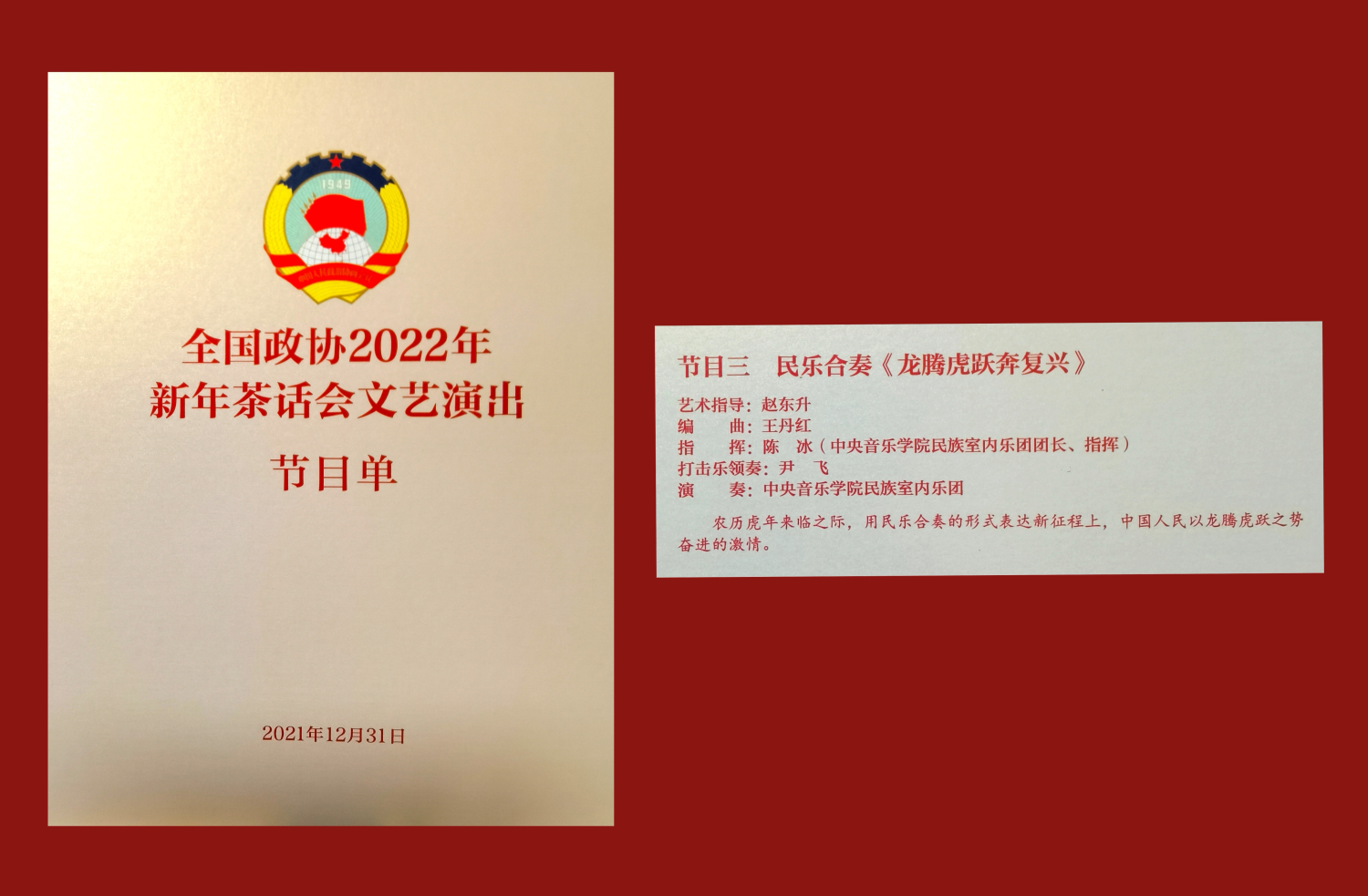 本次演出的作品《龙腾虎跃奔复兴》由著名作曲家王丹红为2022年全国政协新年茶话会编曲,乐团音乐总监陈冰教授执棒,特邀kaiyun体育网页登录入口民乐系教师尹飞担任打击乐领奏,唢呐专业教师张维维及民乐系众多优秀学生倾情出演。