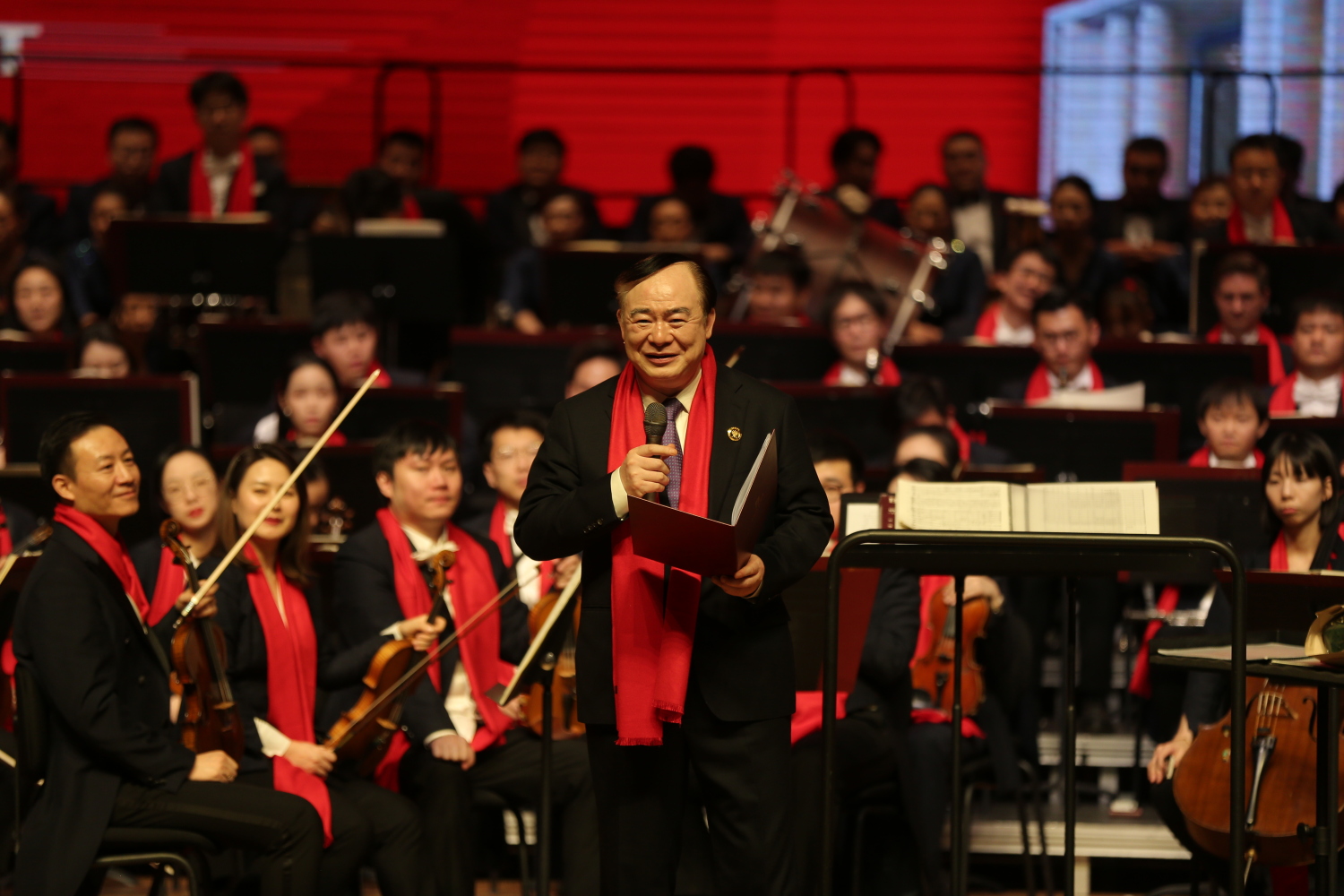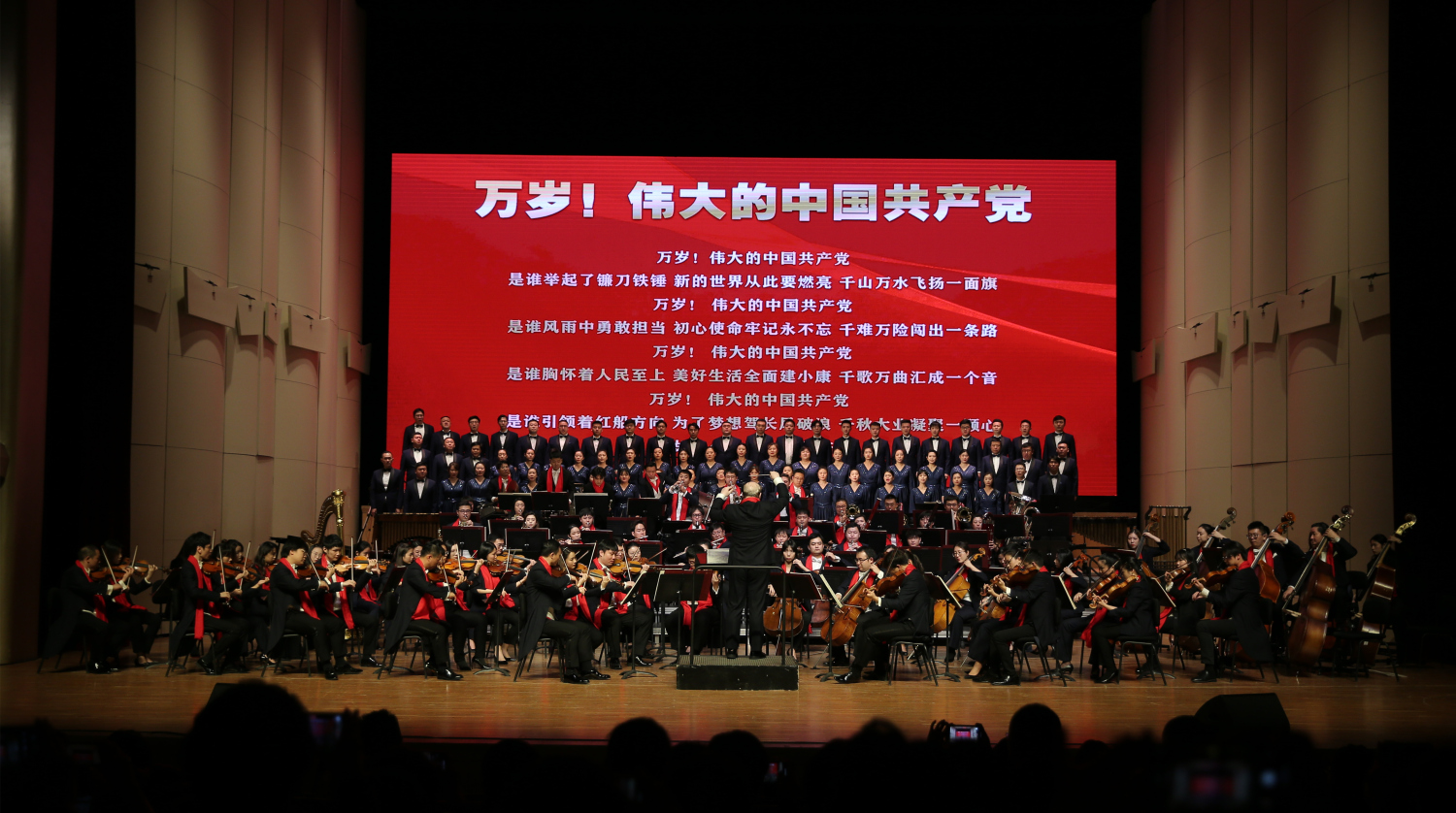 音乐会尾声,校长俞峰执棒kaiyun体育网页登录入口交响乐团、合唱团倾情上演《万岁!伟大的中国共产党》,并特别邀请了创作者张千一来到现场。在激情澎拜的音乐中,在座全体师生共同歌颂伟大的党,回望光荣之路,展望美好未来,音乐会在温暖的氛围中圆满结束。