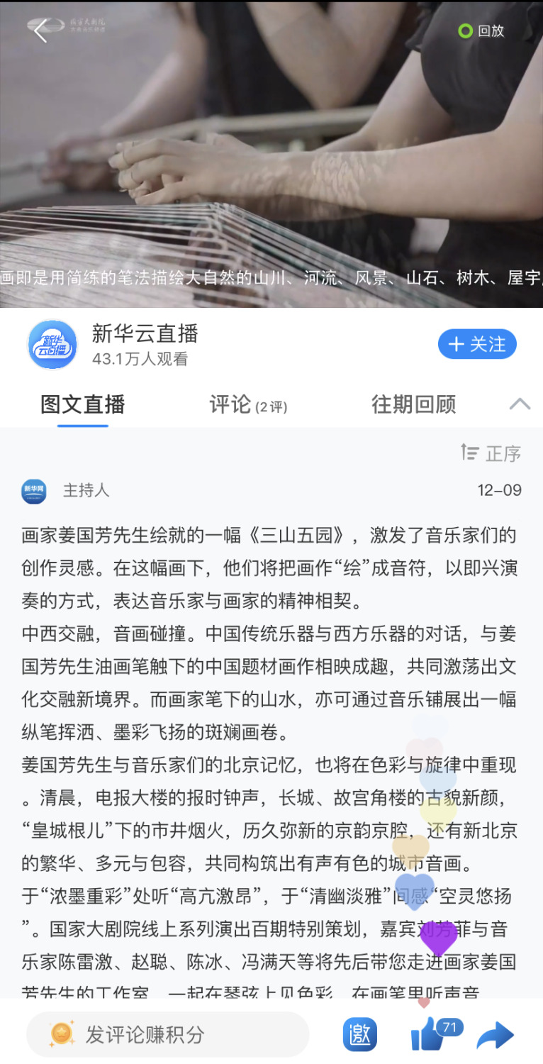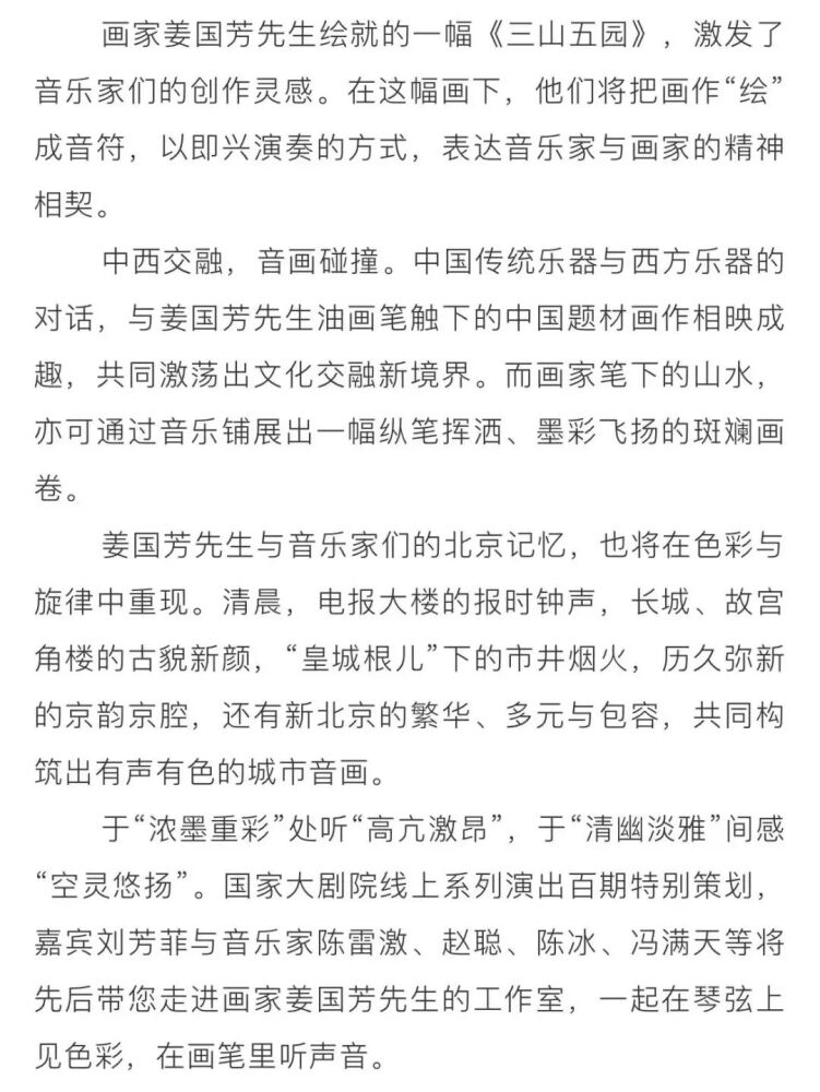 kaiyun体育网页登录入口民族室内乐团受邀参演国家大剧院线上系列演出100期特别策划:“画韵京音——走进画家姜国芳工作室线上音乐会”,点击量达到2900万,获得海内外广泛关注与好评。