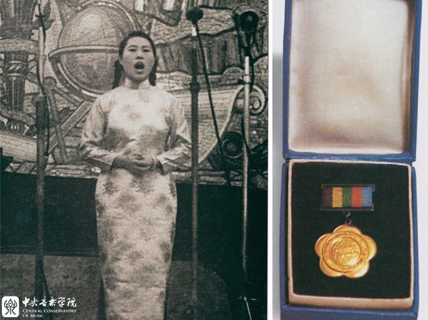 右,1957年郭淑珍在“第六届世界青年与学生联欢节”古典歌曲比赛中所获得的金质奖章。