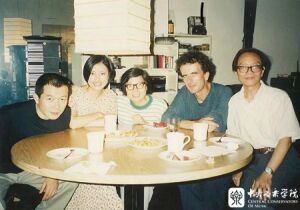 1993年,钟子林(右1)与何乾三教授(中间)在美国纽约谭盾(左1)家中。