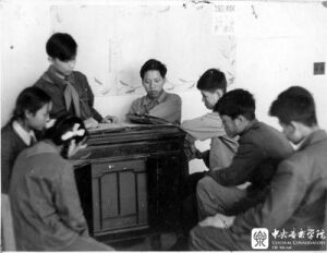同学们围坐在一起认真听唱片,是20世纪50年代“央音”校园的一道独特风景。