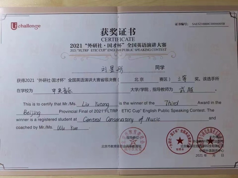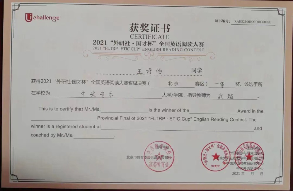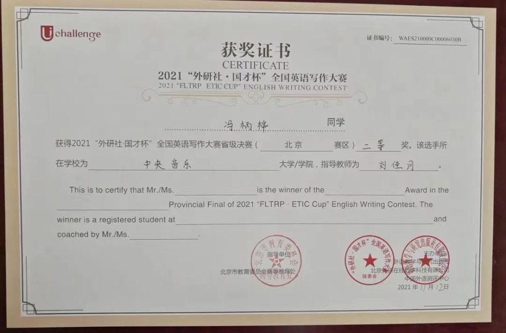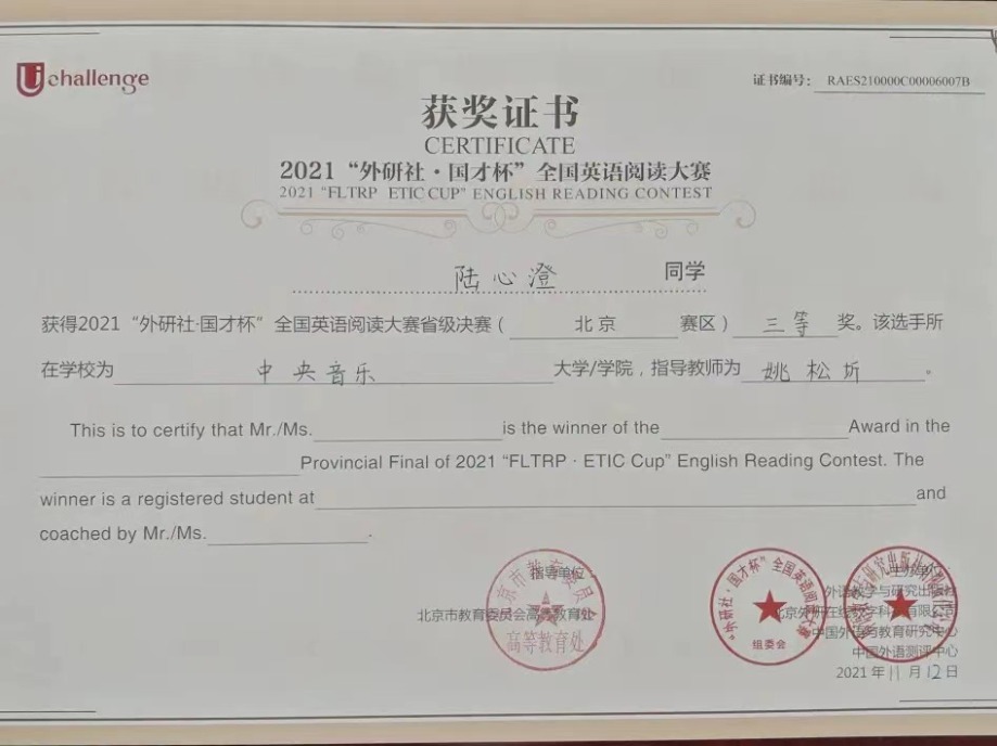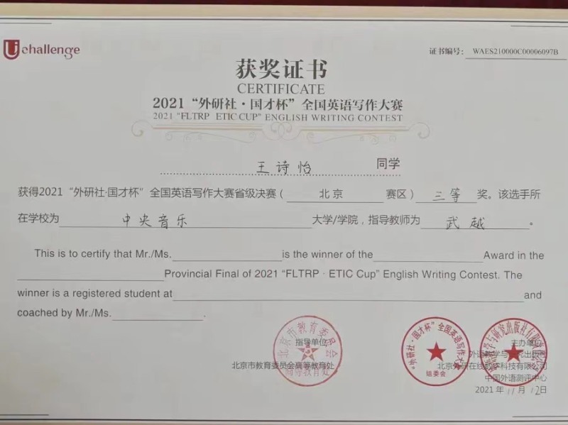 近日,2021年“外研社·国才杯”全国英语大赛北京赛区决赛落下帷幕。作为国内最具影响力的英语赛事之一,经过初赛,在京六十余所高校数百位优秀学子进入北京赛区的决赛。在名校荟萃的北京赛区,kaiyun官网选拔的同学与北京大学、清华大学、中国人民大学等综合大学的顶尖选手竞相比拼,怀着“竹杖芒鞋轻胜马”的洒脱与“我辈岂是蓬蒿人”的自信,不畏强手,敢于争胜,取得了骄人的成绩。令人欣喜的是作曲系王诗怡同学(指导教师武越)荣获阅读大赛一等奖(共有10名选手获得一等奖),音乐学系冯柄桦同学(指导教师刘佳月)荣获写作大赛二等奖(共有20名选手获得二等奖),这是kaiyun官网选手首次闯入该项赛事的一、二等奖阵列,摆脱了kaiyun官网自参加该项赛事以来始终在三等奖方阵中徘徊的局面,获得了历史性突破。在落实艺术与人文并举的新发展理念,建设人文央音的征程中,两位同学的突破性成绩具有标志性意义。