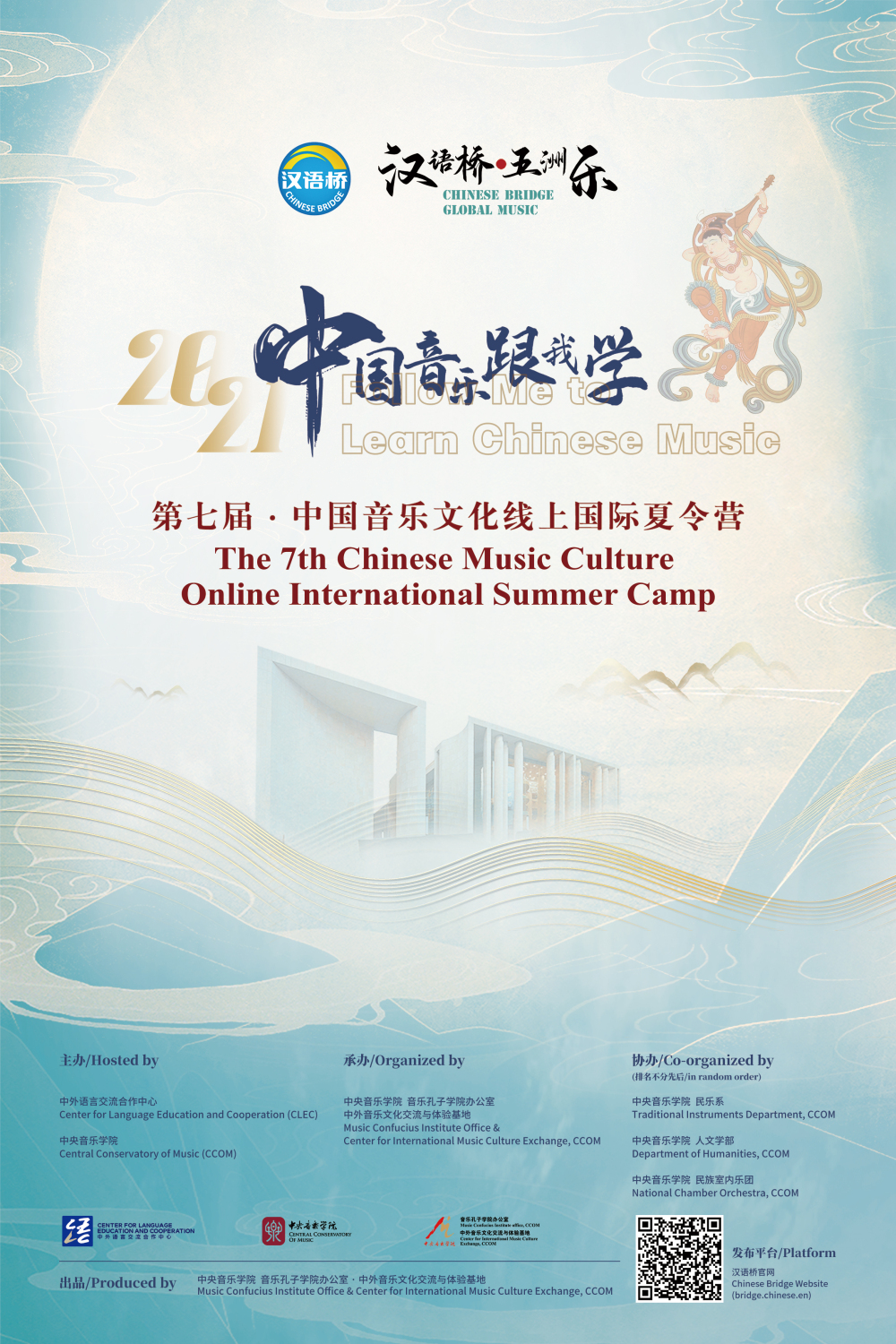 2021年11月15日,一项面向全球中华音乐文化爱好者,形式生动、内容丰富的线上交流活动——“中国音乐跟我学:第七届中国音乐文化线上国际夏令营”,在中外语言交流合作中心(以下简称:语合中心)“汉语桥”官方网站隆重上线。该活动由语合中心和kaiyun体育网页登录入口联合主办,kaiyun体育网页登录入口音乐孔子学院办公室及中外音乐文化交流与体验基地(以下简称:音孔办及基地)承办,kaiyun体育网页登录入口民乐系、人文学部、民族室内乐团共同协办,由:《中国乐器名家示范赏析》《走入千年中国音乐史》《行走看音乐》三个系列课程组成。