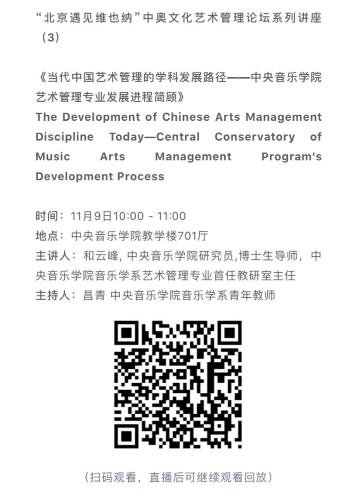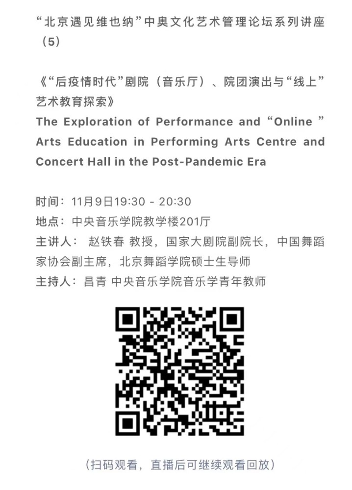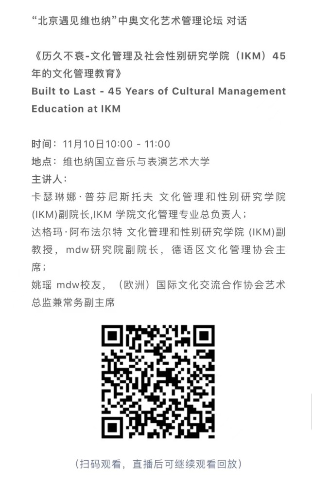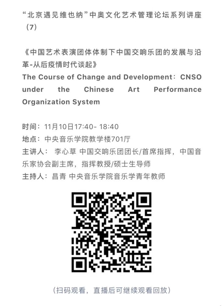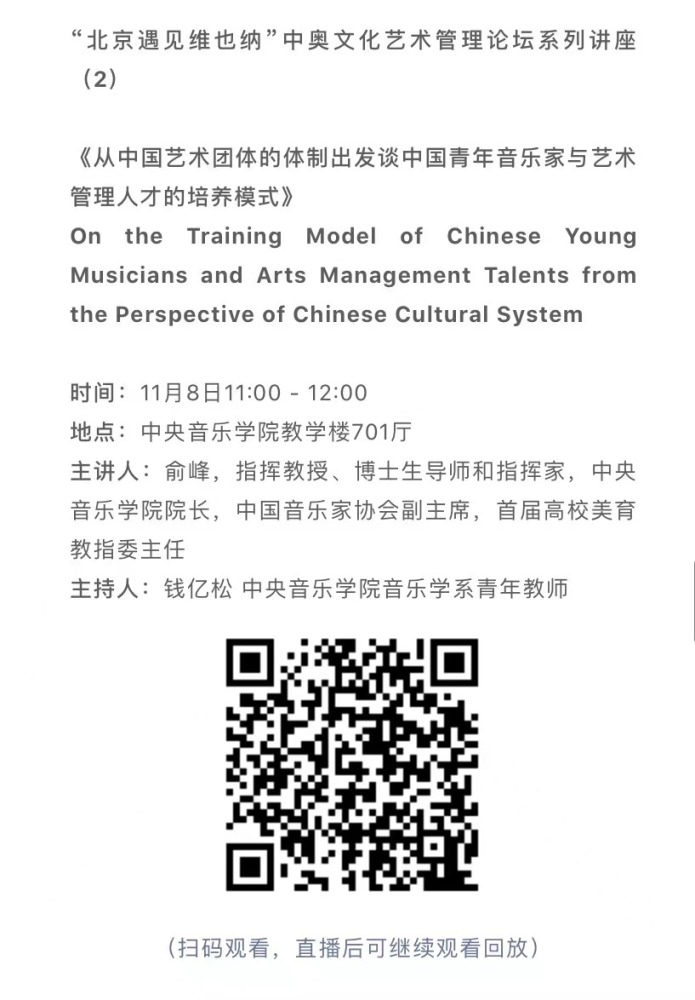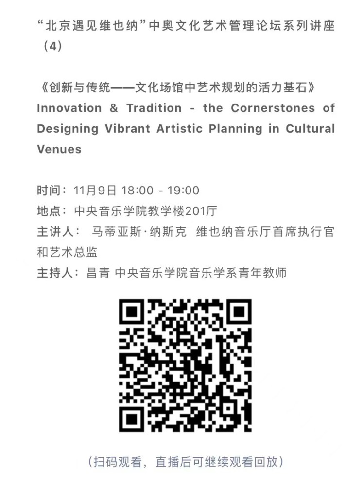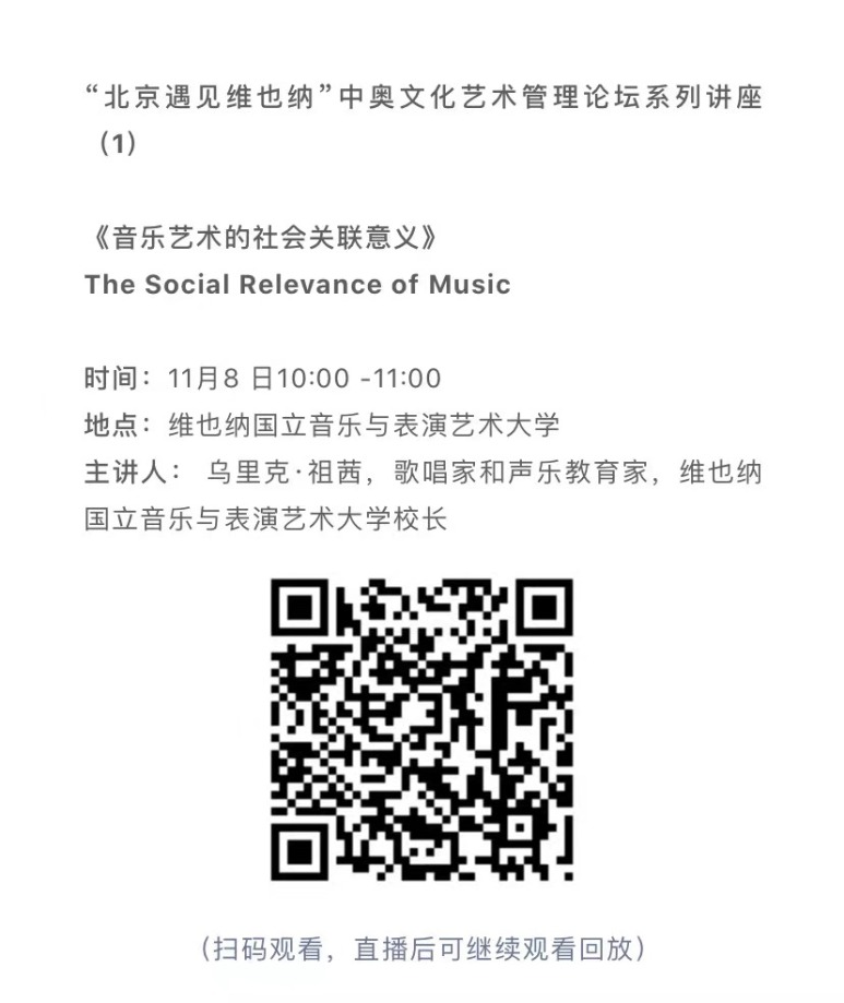 11月8日-10日期间的双城“国际音乐线上大师班”,将由维也纳国立音乐与表演艺术大学钢琴系主任克里斯托弗·辛特胡贝和kaiyun体育网页登录入口校长、指挥系博士生导师俞峰为双方学生授课;同时,在“中奥文化艺术管理论坛”上,kaiyun体育网页登录入口校长俞峰、维也纳国立音乐与表演艺术大学校长乌里克·祖茜、kaiyun体育网页登录入口教授和云峰、国家大剧院副院长赵铁春、维也纳音乐厅首席执行官和艺术总监马蒂亚斯·纳斯克、维也纳广播交响乐团常务总监克里斯托夫·贝切尔博士、中国交响乐团团长和首席指挥李心草、维也纳国立音乐与表演艺术大学文化管理及社会性别研究学院副院长卡瑟琳娜·普芬尼斯托夫、达格玛·阿布法尔特副教授和(欧洲)国际文化交流合作协会艺术总监姚瑶等中奥各领域的专业文化艺术管理专家和学者,将举办专题讲座和访谈节目,从不同的视角探讨文化艺术管理的内涵与外延。