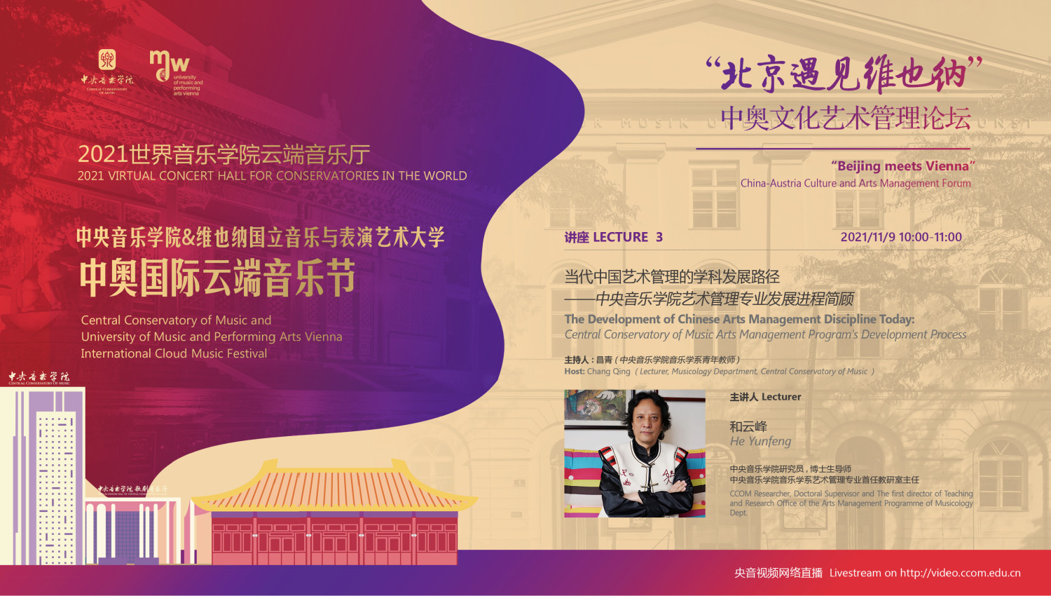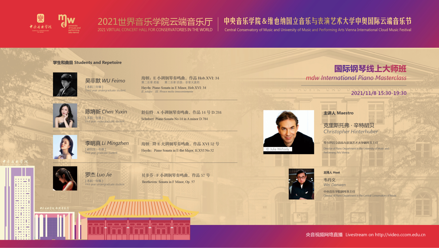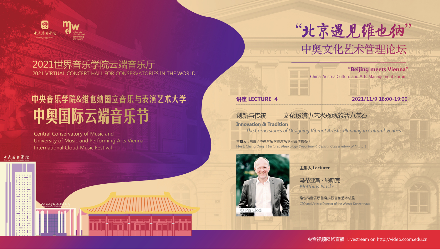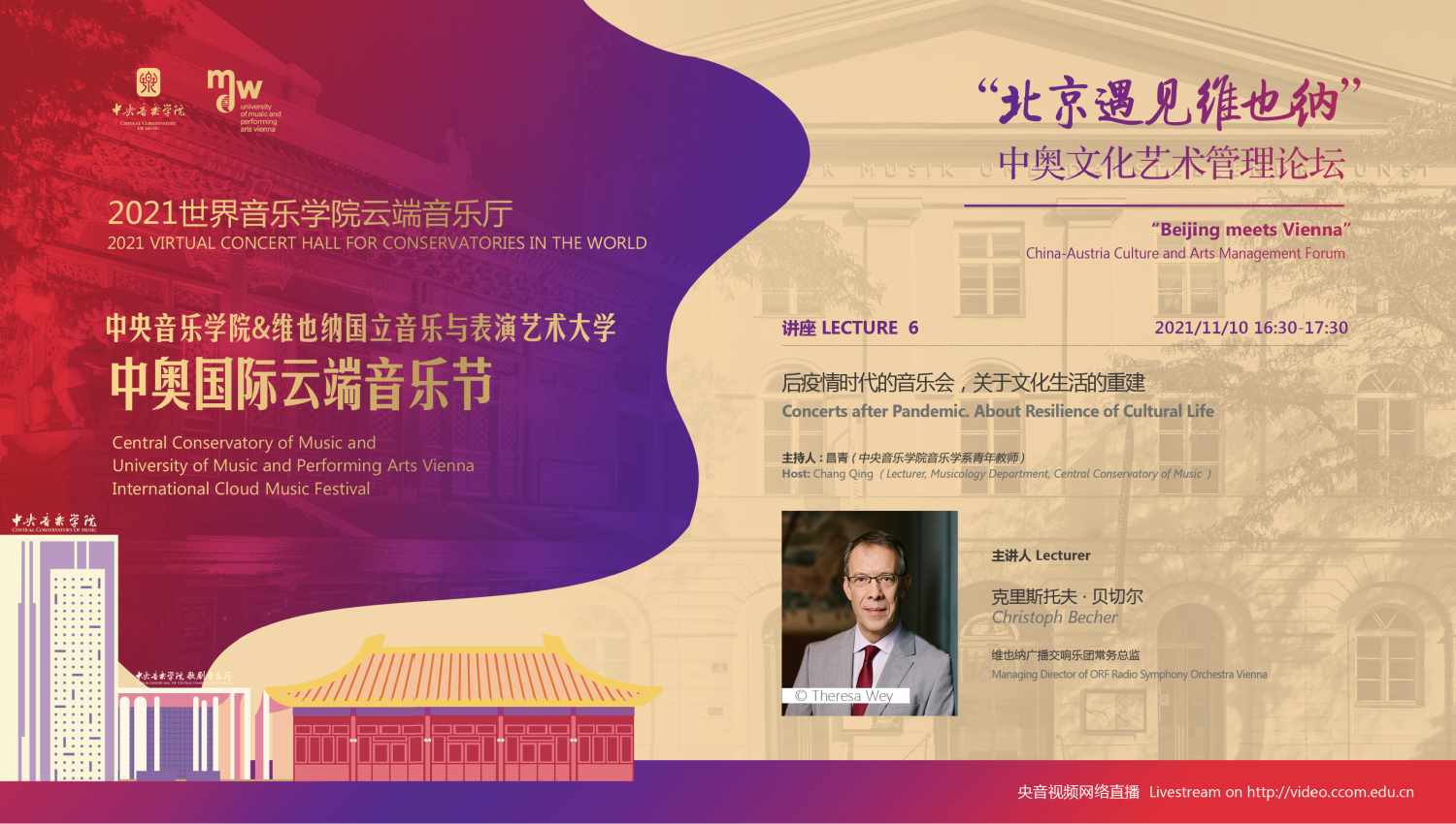 11月8日-10日期间的双城“国际音乐线上大师班”,将由维也纳国立音乐与表演艺术大学钢琴系主任克里斯托弗·辛特胡贝和kaiyun体育网页登录入口校长、指挥系博士生导师俞峰为双方学生授课;同时,在“中奥文化艺术管理论坛”上,kaiyun体育网页登录入口校长俞峰、维也纳国立音乐与表演艺术大学校长乌里克·祖茜、kaiyun体育网页登录入口教授和云峰、国家大剧院副院长赵铁春、维也纳音乐厅首席执行官和艺术总监马蒂亚斯·纳斯克、维也纳广播交响乐团常务总监克里斯托夫·贝切尔博士、中国交响乐团团长和首席指挥李心草、维也纳国立音乐与表演艺术大学文化管理及社会性别研究学院副院长卡瑟琳娜·普芬尼斯托夫、达格玛·阿布法尔特副教授和(欧洲)国际文化交流合作协会艺术总监姚瑶等中奥各领域的专业文化艺术管理专家和学者,将举办专题讲座和访谈节目,从不同的视角探讨文化艺术管理的内涵与外延。