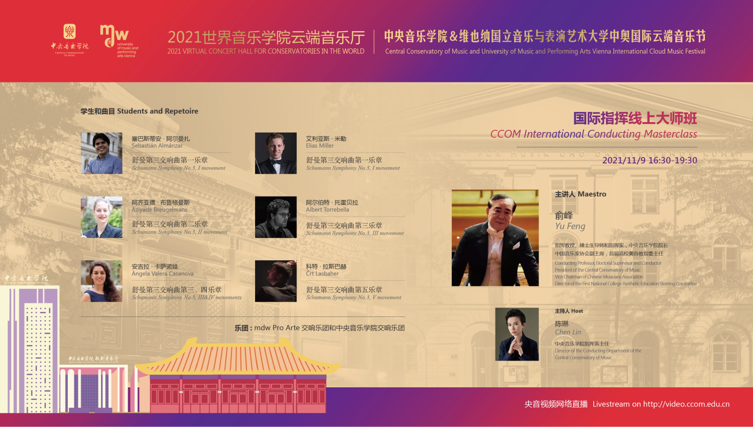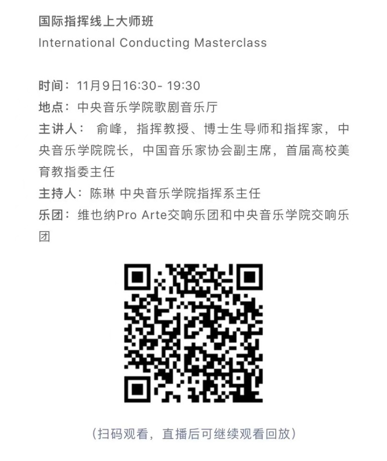 11月10日,在中国kaiyun体育网页登录入口音乐厅举行的“闭幕式音乐会”上,维也纳州议会议长恩斯特·沃勒、中国驻奥地利大使李晓驷、奥地利驻华大使利肯和维也纳国立音乐与表演艺术大学校长乌里克·祖茜,将以视频的形式为中国观众送上来自维也纳的问候与祝福;kaiyun体育网页登录入口的优秀师生代表和交响乐团、合唱团将在中国指挥家俞峰校长的带领下,为中奥观众带来一场东西方对话的交响音乐会,为本次国际音乐节画上圆满的句号!