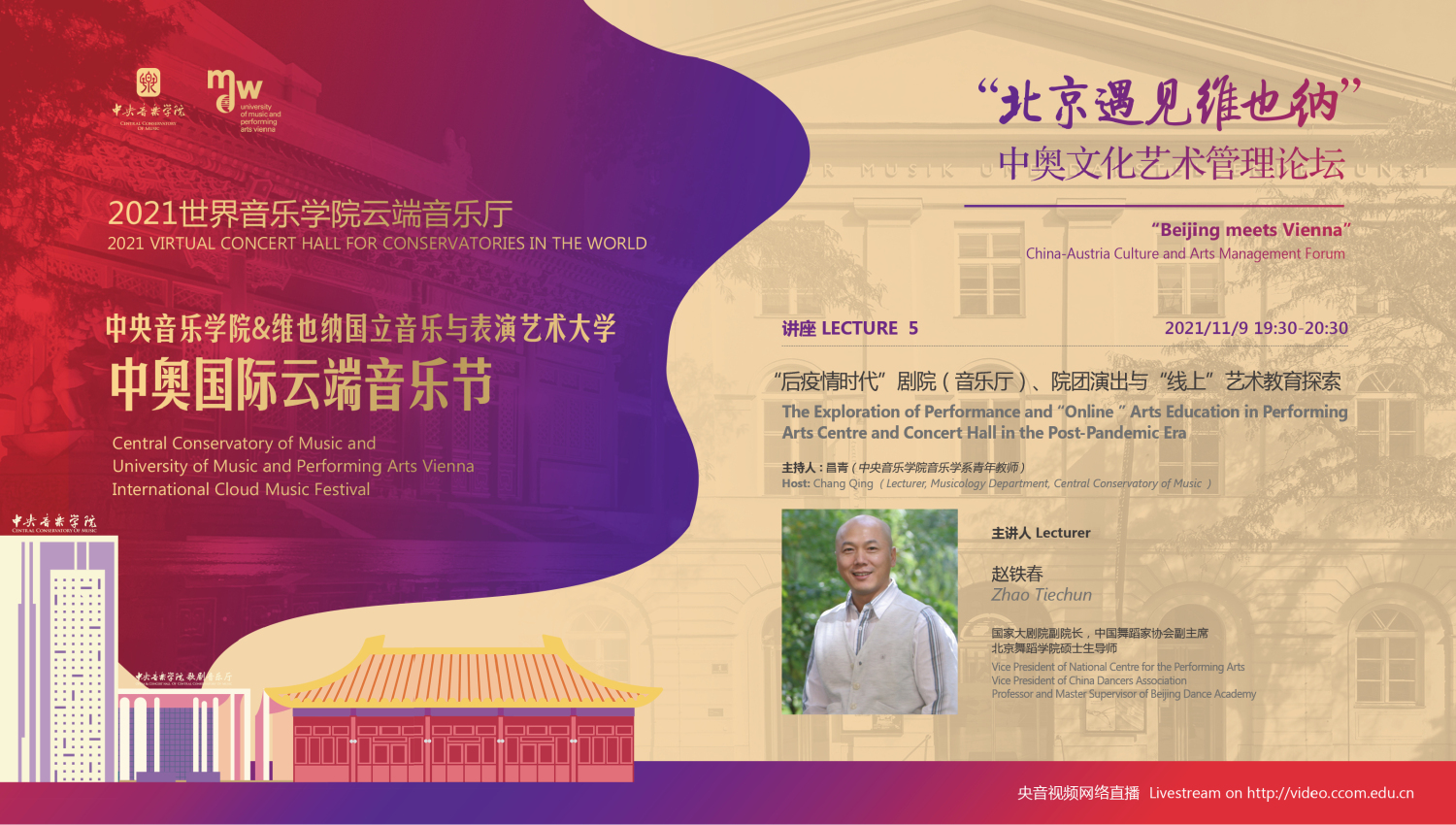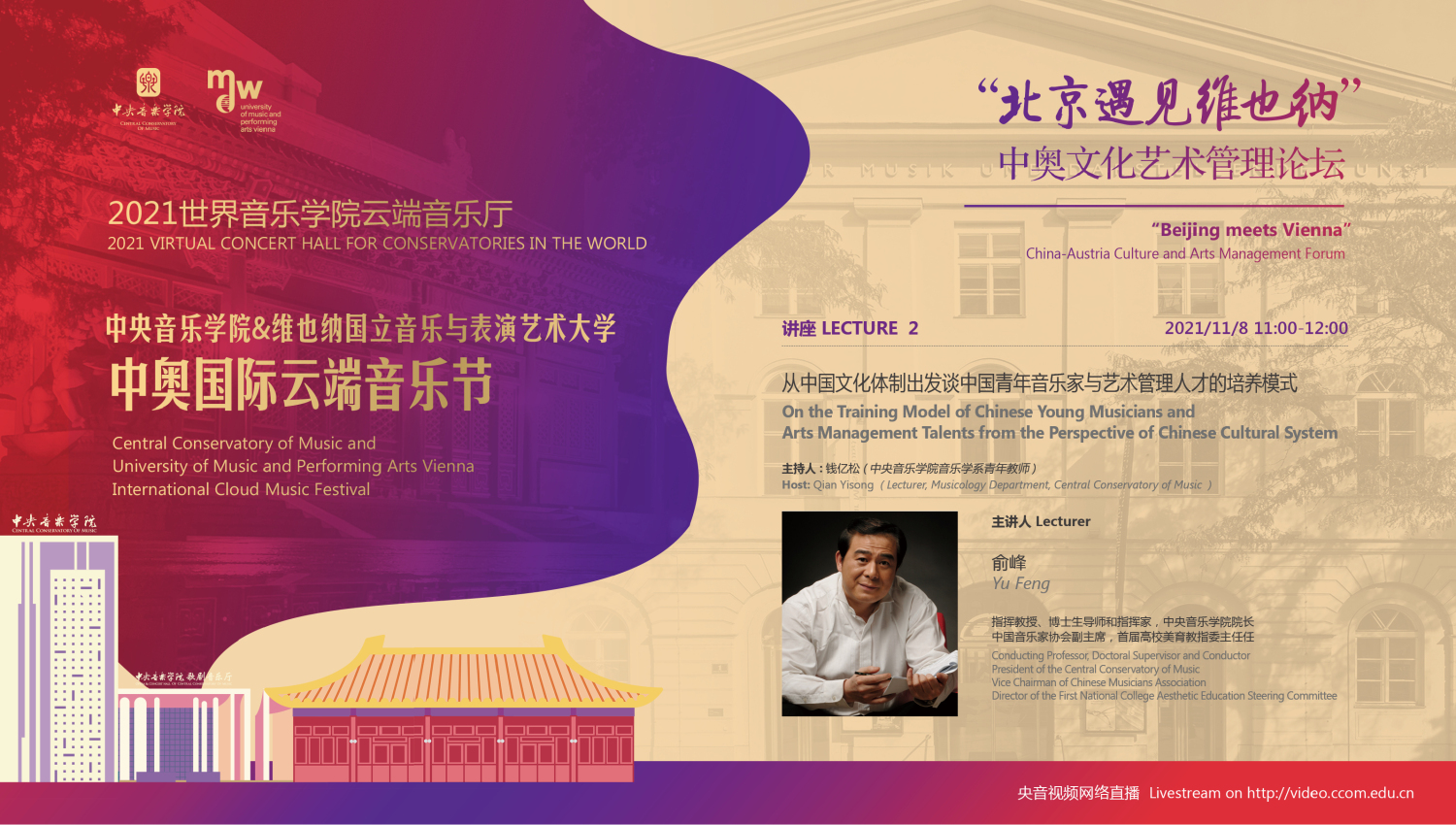 2021中奥国际云端音乐节是两校为了纪念中奥建交50周年共同举办的文化教育交流活动。音乐节将以线上线下的形式,连线两国首都——北京和维也纳,进行为期四天的音乐艺术与教育交流合作。包括在维也纳音乐厅举行的“开幕式音乐会”、双城“国际音乐线上大师班”和“中奥文化艺术管理论坛”,以及在北京kaiyun体育网页登录入口音乐厅举行的“闭幕式音乐会”四个主要部分。