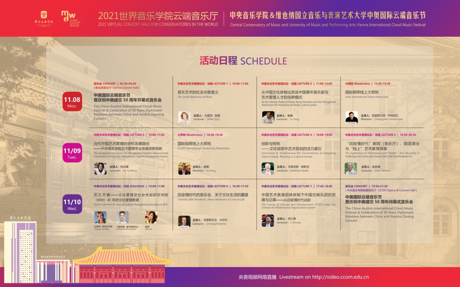 2021年,中国和奥地利迎来了建交50周年的历史性时刻,在这个特殊的年份中,两校更是积极响应,共同举行此次中奥“国际云端音乐节”。此次音乐节活动得到了中国驻奥地利大使馆、奥地利驻中国大使馆,维也纳市政府、维也纳音乐厅,中国艺术管理协会,中国国家大剧院,中国交响乐团、(欧洲)国际文化交流合作协会及欧中文化、教育与科学协会等多个中奥机构的大力支持。维也纳国立音乐与表演艺术大学校长乌里克·祖茜, 奥地利驻华大使利肯, 中国驻奥地利大使李晓驷,维也纳州议会第一议长恩斯特·沃勒纷纷发来视频致辞!